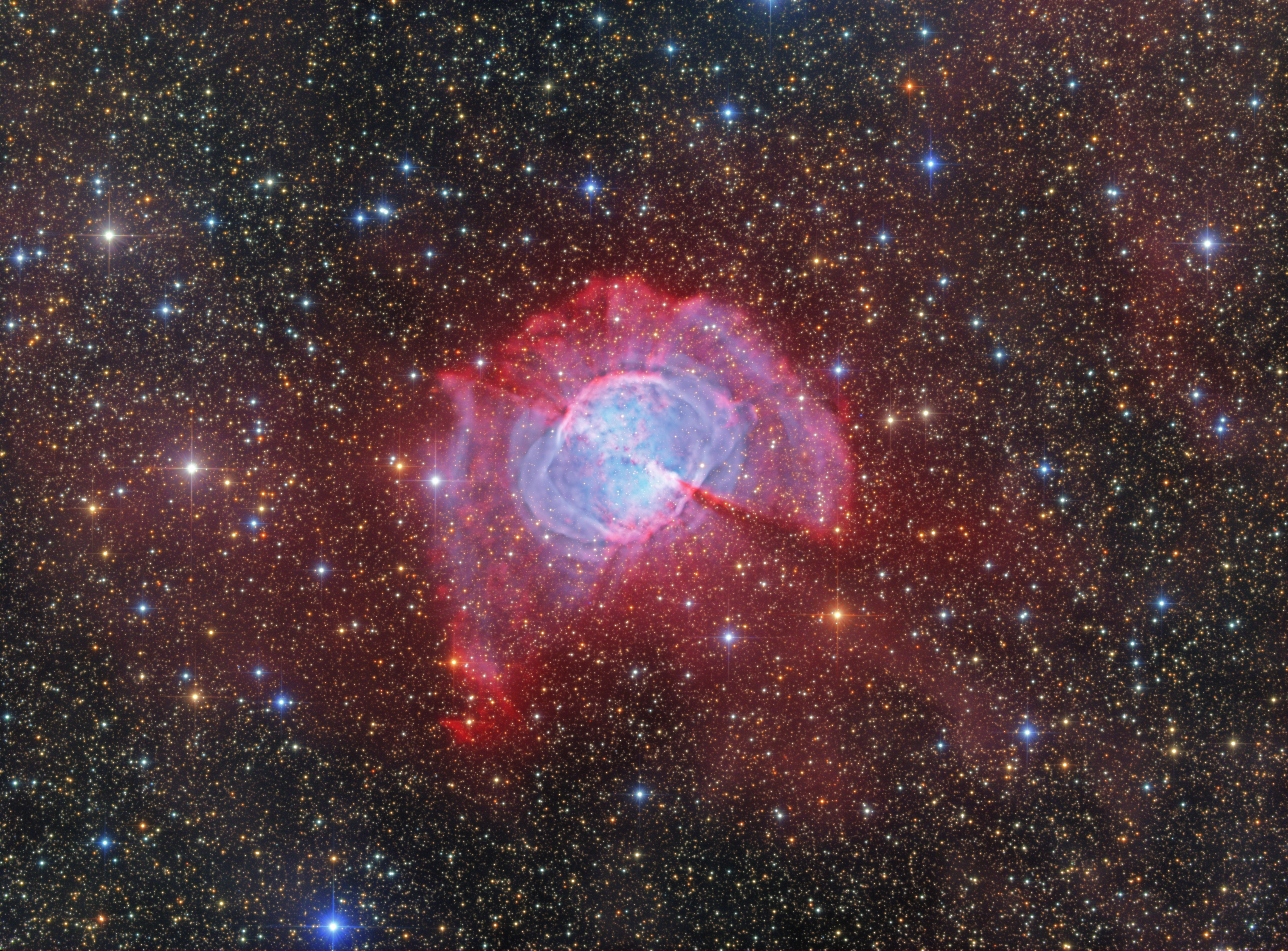 Die mit knapp 80h belichtete Aufnahme zeigt den Hantelnebel, M27, mit einem extrem schwache äusseren Halo. Belichtet wurde mit H-Alpha, [OIII], L, R, G, und B-Filtern. Belichtungen: Robert Pölzl und Fabian Neyer