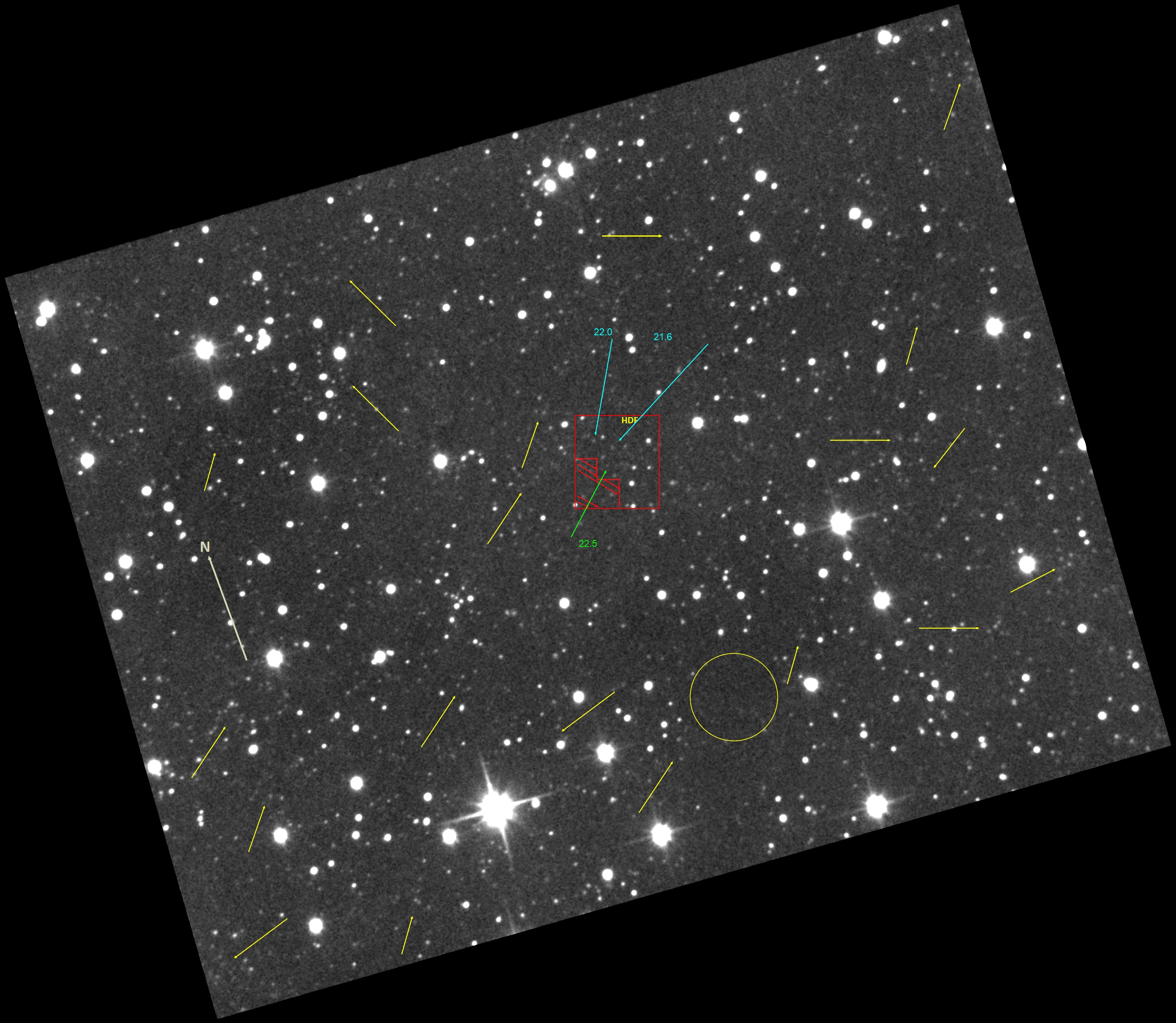 Zoomt man stark ins Bild hinein und und schaut genau hin, so sieht man - über das gesamte Bildfeld verstreut - unzählige Galaxien (gelbe Pfeile), in ihrer Helligkeit vergleichbar mit den Galaxien im HDF (blau und grün). Alle zusammen bilden die Filamente des galaktischen Spinnennetzes. Ihre Entfernung kann man auf meiner Aufnahme zu etwa fünf bis sechs Milliarden Lichtjahren bestimmen. Ihr Licht ging auf die Reise, als sich unsere Sonne gerade aus dem galaktischen Urnebel zu formen begann! Wow! Einige Bogenminuten südlich des HDF finden wir einen Bereich (Kreis), in dem es keine Galaxien zu sehen gibt, wenigstens keine helleren als 22 mag. Wer weiß, wie dieses Hubble Deep Field ausgesehen hätte!