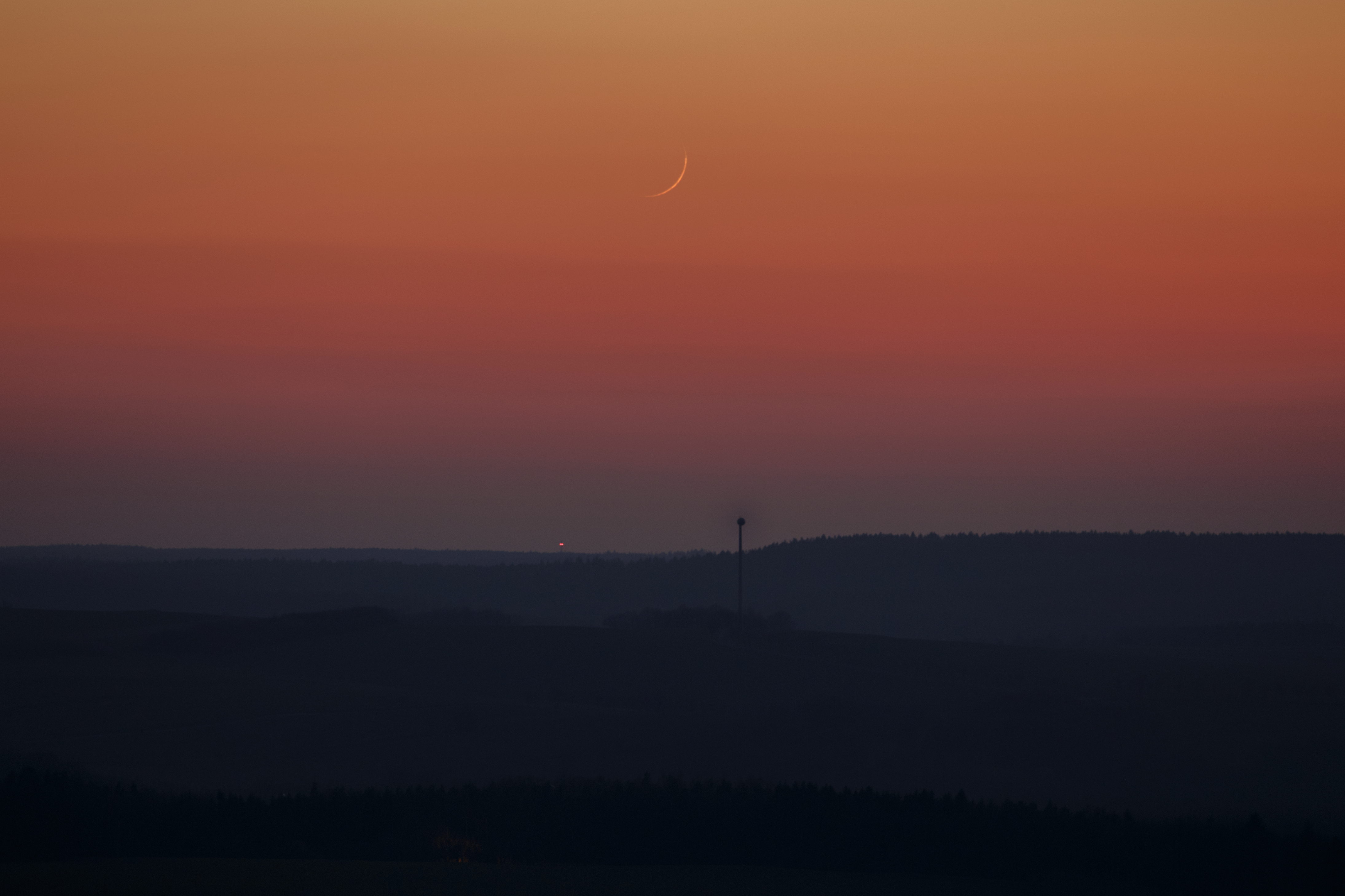 Am 25. März 2020 gab es besonders gute Voraussetzungen, eine sehr junge Mondsichel, – nur 32,6 h nach Neumond – kurz nach Sonnenuntergang aufzusuchen. Ich fuhr auf den 426 m hohen Lerchenberg bei Börnchen, um freie Horizontsicht zu haben. Anfangs war es gar nicht so leicht, die Sichel im deutlich dichteren Dunst als noch an den Vortagen zu entdecken. Aber je dunkler es wurde, um so freisichtiger wurde sie auch für das bloße Auge. Sie wirkte sehr filigran, fast zerbrechlich. Die Höhe betrug zum Aufnahmezeitpunkt 2,5° bei einem Beleuchtungsgrad von gerade einmal 1,7 Prozent! Ein beeindruckender Anblick!