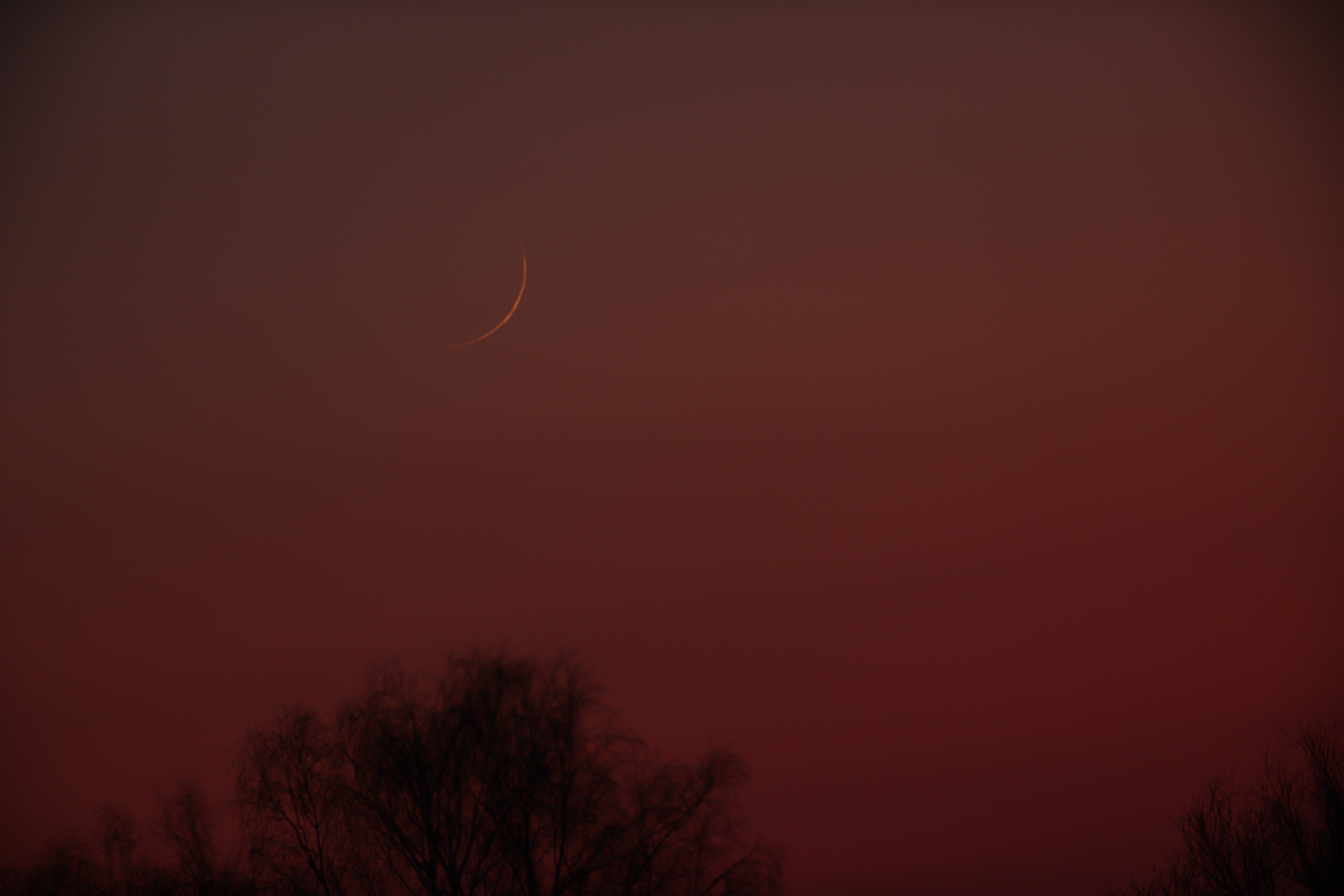 Am Abend des 25. März war ein schöner klarer Abendhimmel. Da habe ich erstmals probiert, mit meiner Ausrüstung die extrem schmale Sichel des Mondes einzufangen.