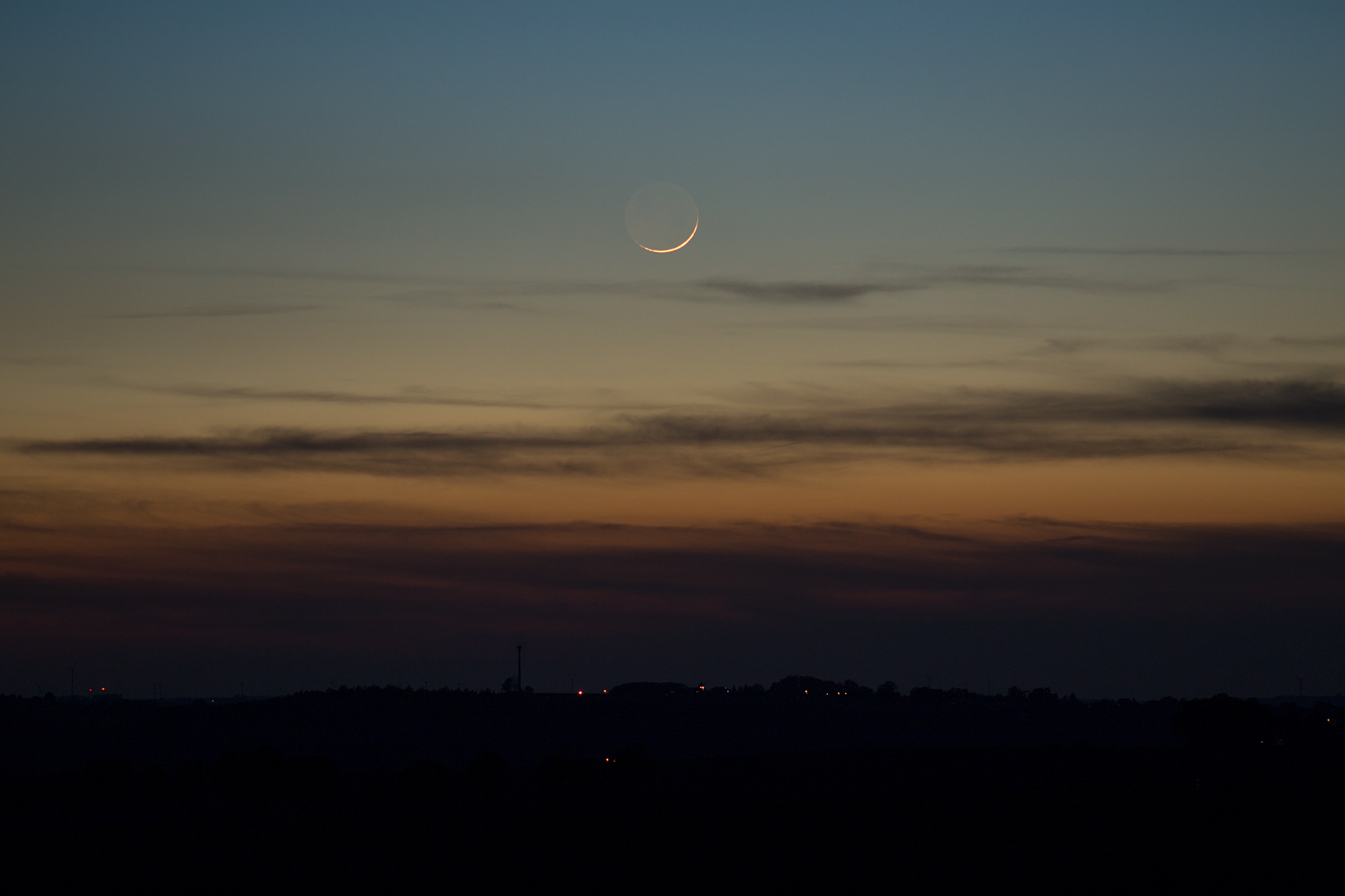 Warmer Frühlingsabend am 28. April 2025 auf dem Lerchenberg (426 m) bei Börnchen. Der Duft vieler Hektar Raps lag in der Luft, dazu über dem Westhorizont die nur 24 h alte Mondsichel. Sehr zerbrechlich wirkend, war sie sofort mit bloßem Auge zu sehen, dank guter Transparenz. Ideale Bedingungen für die Sichtbarkeit, wettertechnisch und astronomisch. Wenn auch einige Cirruswolken am Himmel unterwegs waren … Fantastische Stimmung.