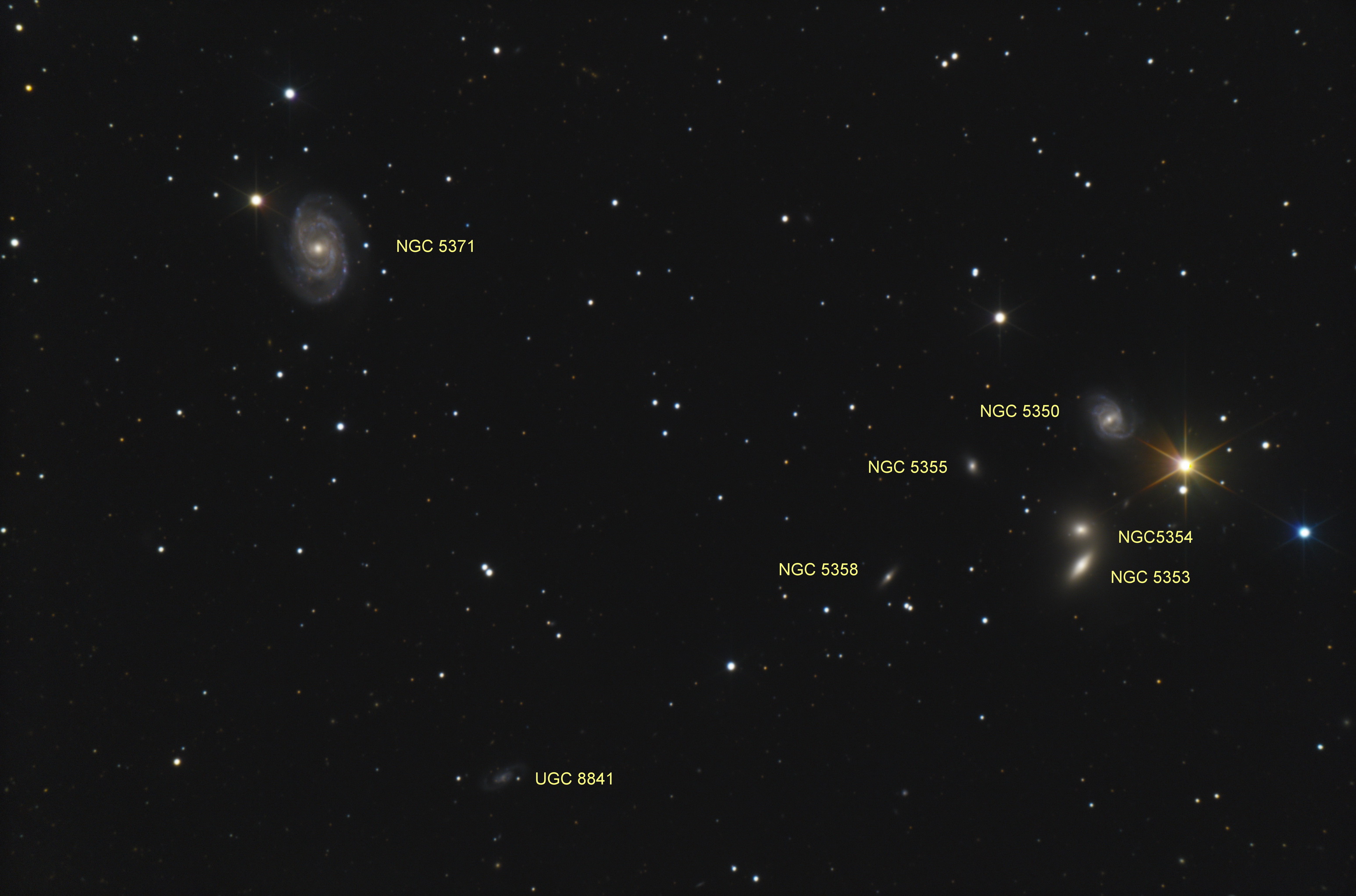 NGC 5350 ist eine Balken-Spiralgalaxie im Sternbild Jagdhunde. Sie ist rund 107 Millionen Lichtjahre von der Milchstraße entfernt und hat einen Durchmesser von etwa 100000 Lichtjahren. Das Objekt ist als Seyfertgalaxie klassifiziert und ein Mitglied der Galaxiengruppe um NGC 5353, auch Hickson Kompakt Gruppe 68 genannt. Ihr gehören unter anderem die Galaxien NGC 5311, NGC 5313, NGC 5355 und NGC 5358 an. NGC 5371 ist eine Balken-Spiralgalaxie vom Hubble-Typ SBbc mit aktivem Galaxienkern im Sternbild Jagdhunde. Sie ist schätzungsweise 118 Millionen Lichtjahre von der Milchstraße entfernt und hat einen Durchmesser von etwa 145.000 Lichtjahren. Sie ist Namensgeberin und die hellste Galaxie der NGC 5371-Gruppe (LGG 361).