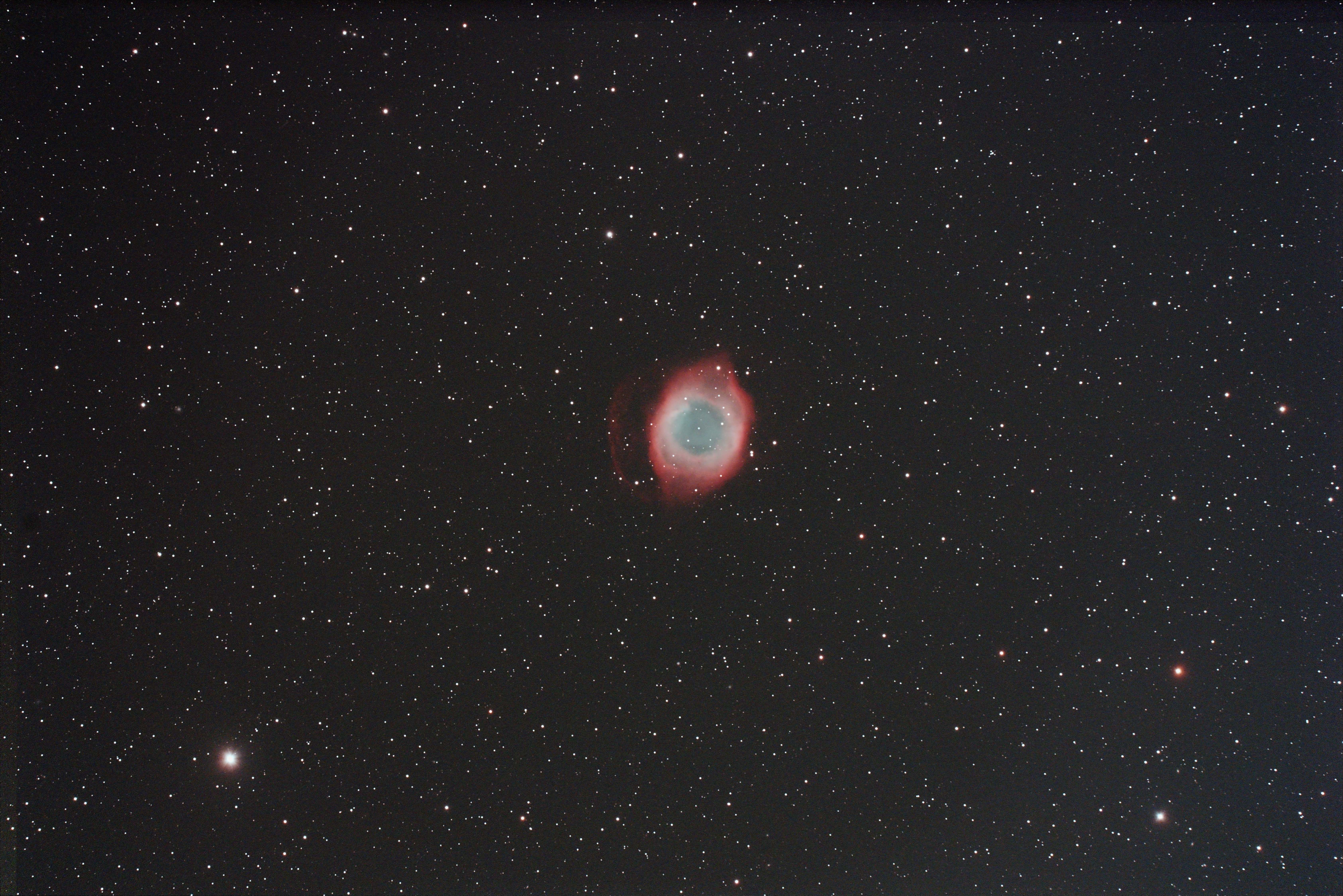 Der Helixnebel NGC 7293 hat für einen Planetarischen Nebel eine sehr große Ausdehnung von etwa 15 x 25 Bogenminuten und besitzt zudem eine recht ansprechende Flächenhelligkeit. Er könnte in unseren heimischen Gefilden ein Star unter den Deep-Sky-Objekten sein – würde er mit einer Deklination von etwa –21° nicht so weit südlich stehen. An meinem Aufnahmeort im Pfälzerwald (Bortle 4-5) erreicht er nicht einmal eine Höhe von 20 Grad über dem Horizont und liegt daher schon in der erheblichen Horizontaufhellung durch die umliegenden Städte.