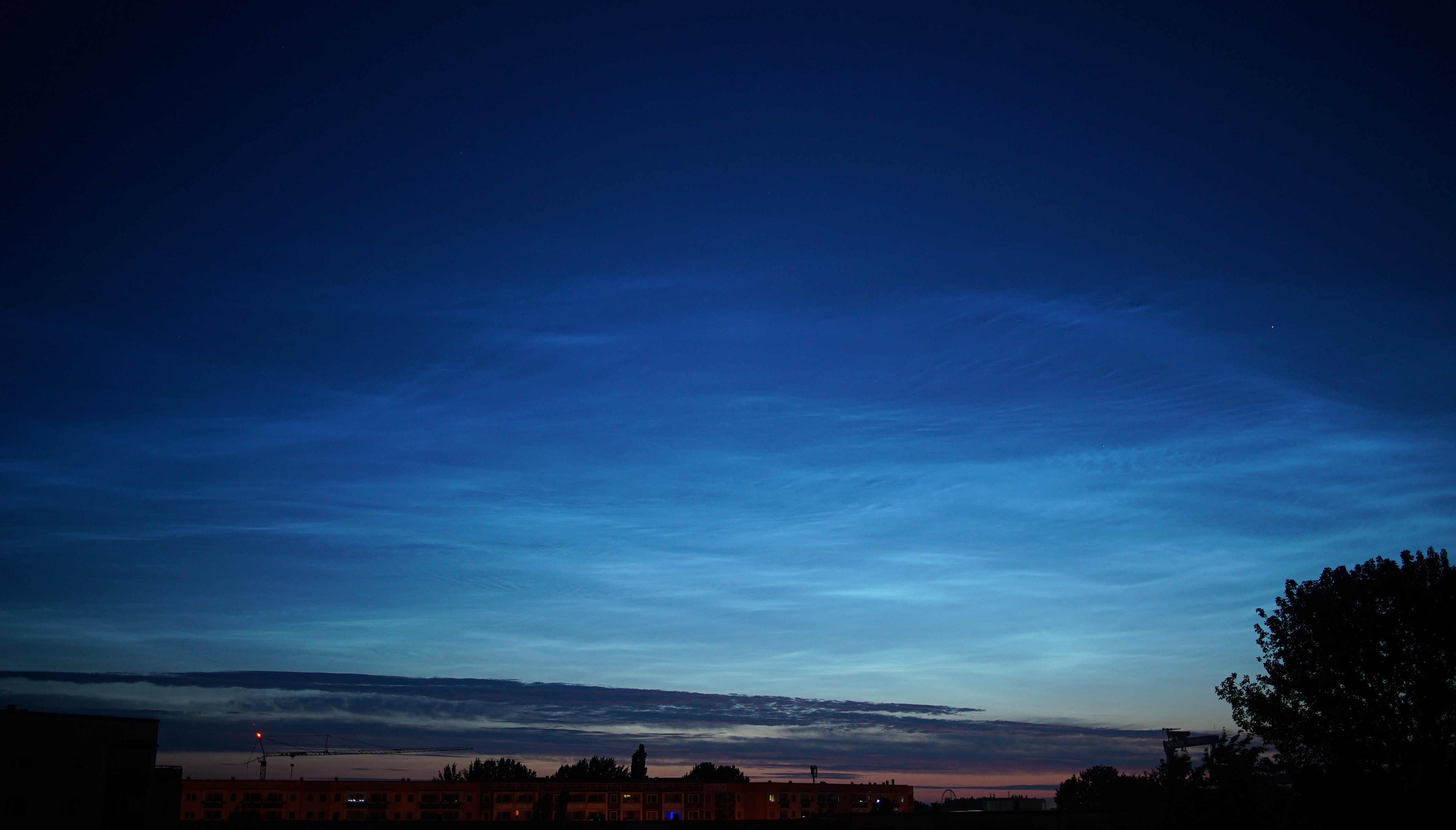 Ein spannender Abend begann mit 8/8 Bewölkung über Rostock und frühzeitigen Sichtungen von Alpen-Webcams. Völlig verblüfft klarte es rasch auf und der Blick ließ erstaunen: Bereits am noch hellen Dämmerungshimmel zeigten sich recht helle NLC, welche letztlich zügig die hellste Stufe (5) erreichten. Hier nun eine Übersichtsaufnahme vom Morgenhimmel mit f = 35 mm mit großer Ausdehnung bei geringerer Helligkeit - aber dennoch faszinierend!