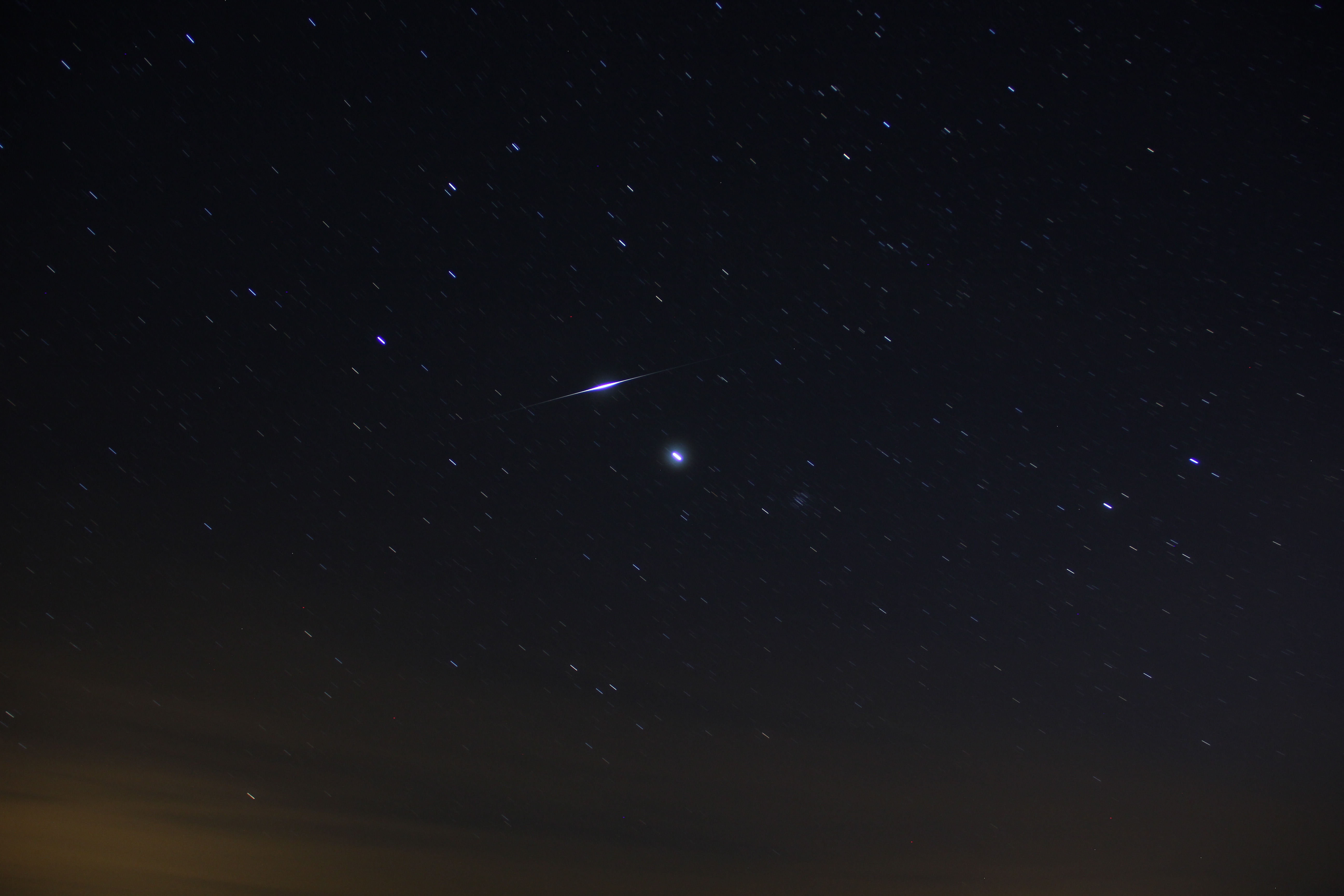 Am Abend des 10. Mai 2015 reflektierten die Antennen des Telekommunikationssatelliten „Iridium 68“ kurz vor Mitternacht das Sonnenlicht so, dass das Ereignis von Uelzen aus beobachtet werden konnte. Dieser sogenannte „Iridium-Flare“ war mit minus 7,2 mag sehr hell und überstrahlte für einen kurzen Augenblick den Jupiter. Seine Strichspur ist auf dem Foto rechts unterhalb des Lichtblitzes zu sehen. Der Satellit und der Planet befanden sich zum Zeitpunkt des Aufblitzens im Sternbild Krebs, zwischen dem Löwen (links oben im Bild) und den Zwillingen (rechts unten mit den hellen Strichspuren von Castor und Pollux).