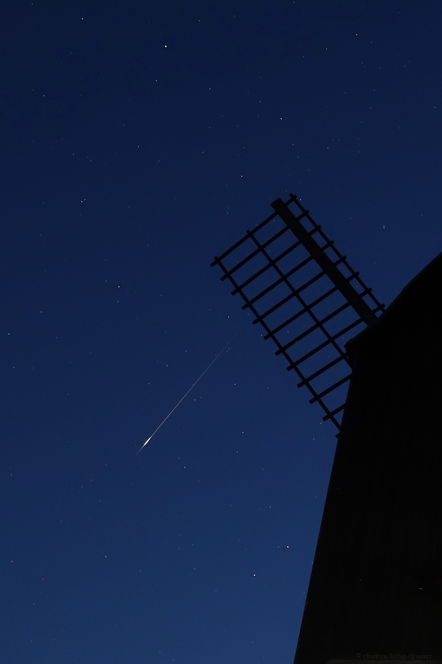 Zu meiner großen Freude machte ich genau zur richtigen Zeit eine Langzeitaufnahme, so dass die Spur der Sternschnuppe in voller Länge auf dem Foto zu sehen ist. Und mein Standort war genau an der richtigen Stelle, so dass die Leuchtspur sehr fotogen an der alten Windmühle vorbeizog. Was wünscht man sich als Himmelsfotografin mehr … !?!