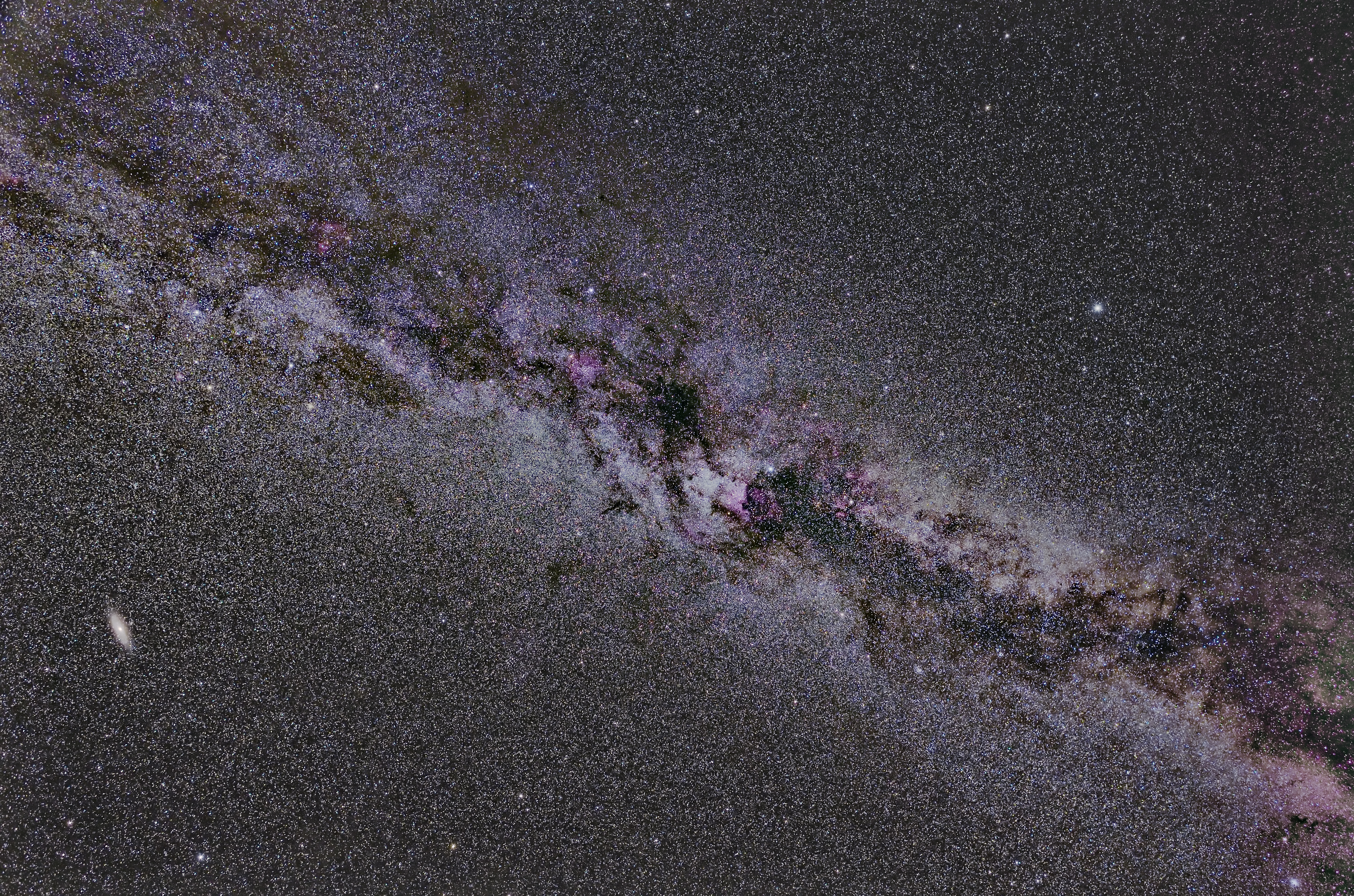 Gar nicht so einfach ist es, eine Weitwinkelaufnahme unserer Milchstraße zu erstellen! Insbesondere der Bildausschnitt will nicht so einfach gelingen, da die Milchstraße im Live-View nicht zu sehen ist. Dann wären da noch die teils erheblichen Helligkeitsgradienten, die bei einem Aufnahmewinkel von fast 90° zwangsläufig vorhanden sind. Diese wurden in mehreren Durchgängen in Fitswork eliminiert.