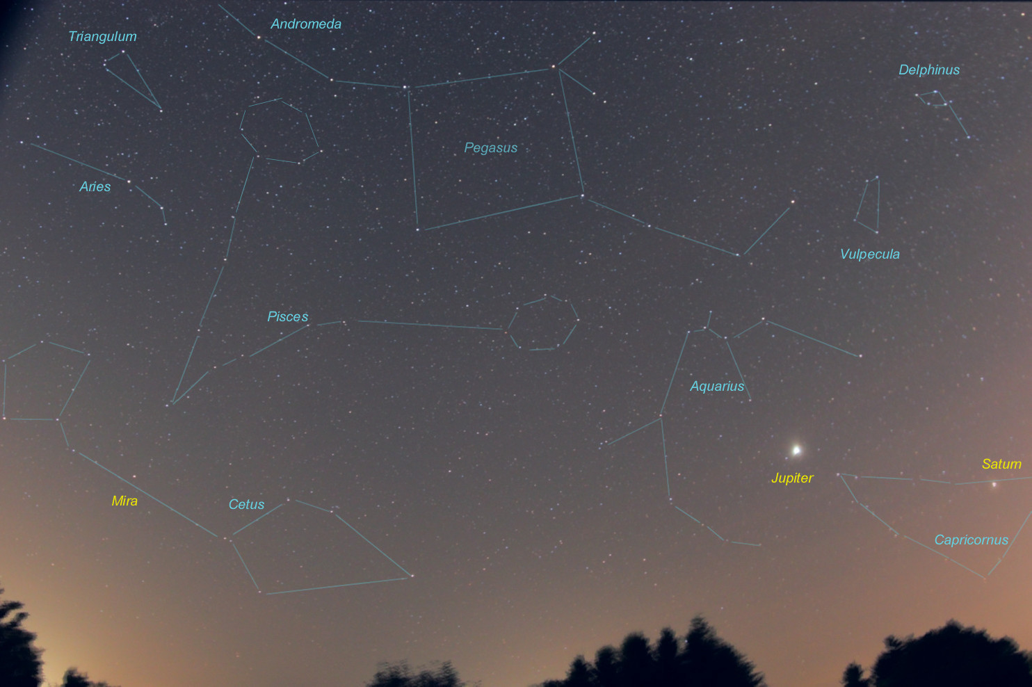 Anläßlich der Perseidennacht ließ ich ein Weitwinkel für ein Starlapse mitlaufen. Einige Bilder zusammenkopiert ergaben dieses Überblicksbild über die Herbststernbilder. Aber was auffällt, ist die helle Mira, die derzeit frei sichtbar ist!