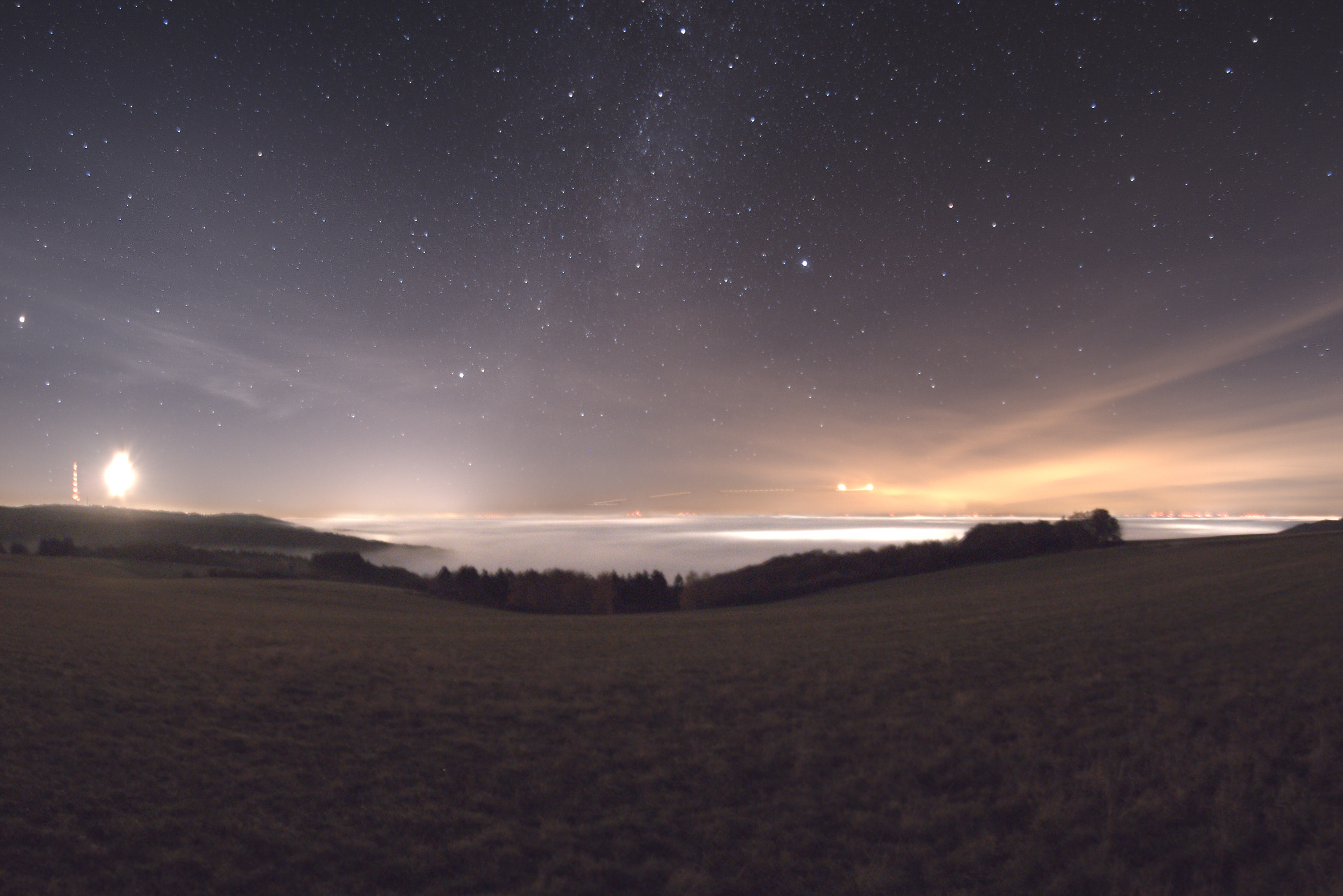 Spontan entstand diese Aufnahme auf der Heimfahrt von der Sternwarte vom Hochwald ins heimische Konz. Auf dem knapp über 500 Meter hochgelegenen Dreikopf bei Steinbachweiher hat man einen wunderbaren Blick Richtung Westen über das Saar Tal, dem Saargau bis nach Luxemburg. Oben ein wunderbar klarer Sternenhimmel und unten der mal wieder drohende Dauernebel. Also Kamera mit Reisemontierung aufbauen und nächtliche Landschaftsfotografie betreiben. Mars am linken Bildrand, der überbelichtete sieben Tage alte Mond als Flutlichtanlage, das untergehende Sommerdreieck über dem Nebelmeer und ein Flugzeug im Landeanflug auf den Flughafen Luxemburg. Auf diesem Bild liegen Freud und Leid des Fotografen nahe beieinander, denn eine halbe Stunde später befand der sich wieder im dicksten Nebel.