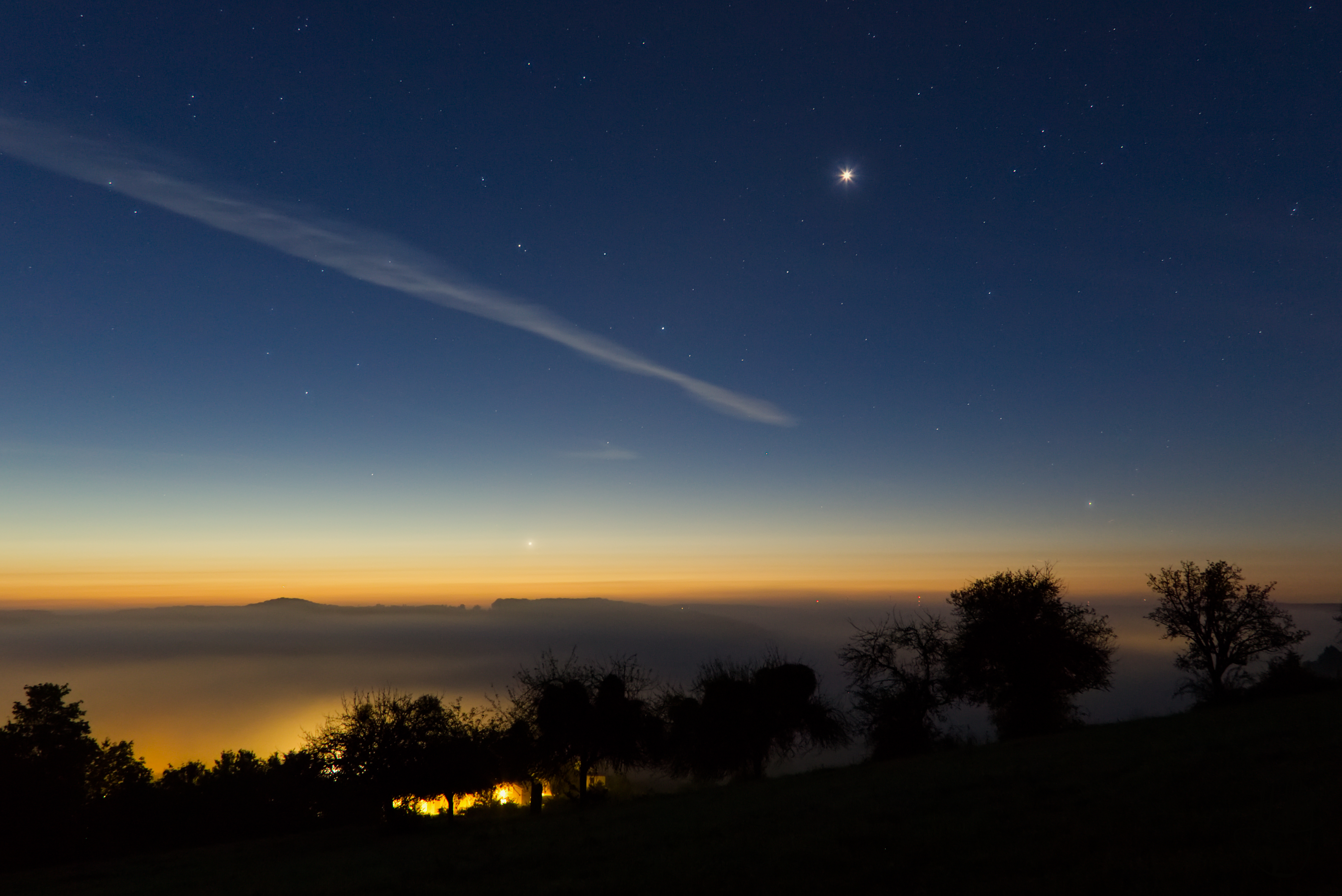 Hier zeigen sich die beiden inneren Planeten am Morgen des 24. September 2023 über dem herbstlichen Nebelmeer des Saartales oberhalb der Gemeinde Fellerich im Saargau.