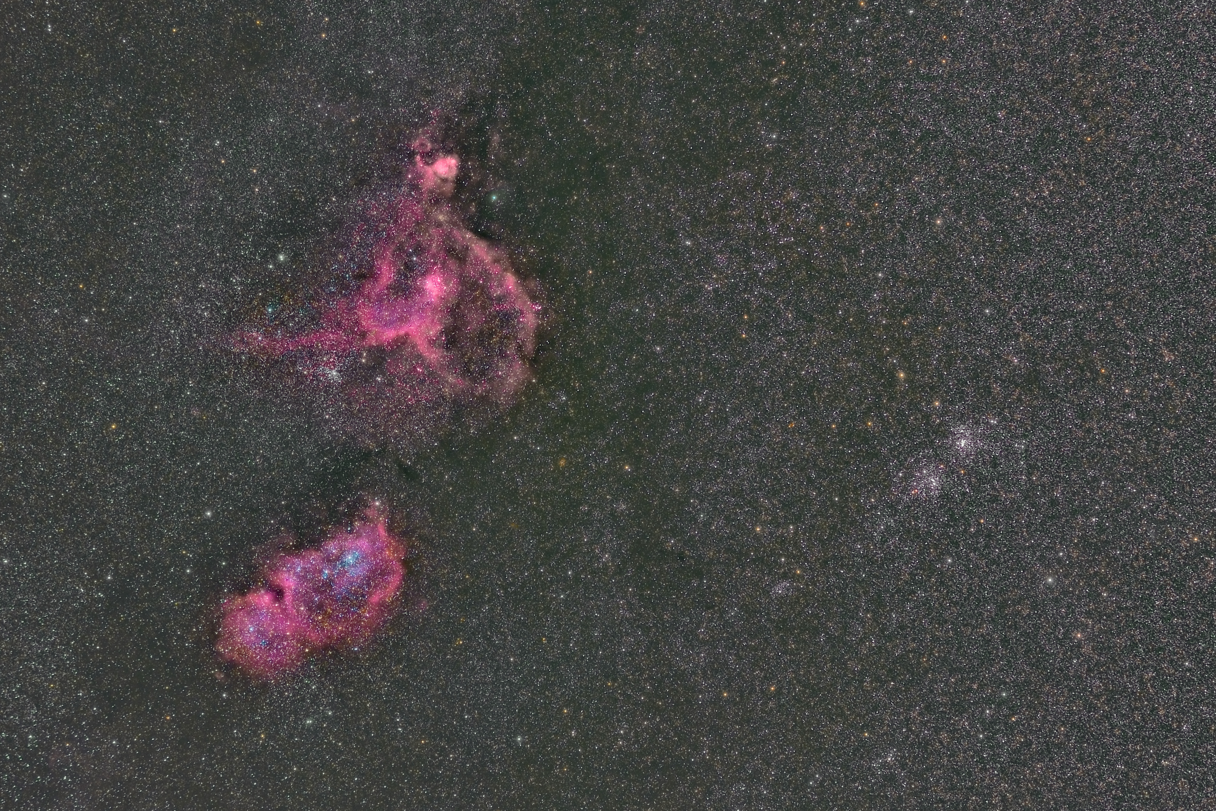 Beim Experimentieren mit Optiken hoher Lichtstärke komme ich zur erstaunlichen Erkenntnis, dass man damit kaum tiefer belichten kann, als mit deutlich schlechterem Öffnungsverhältnis. Beispielhaft sei hier dieses Foto des Herz- und Seelennebels gezeigt, das 30 Aufnahmen zu je vier Minuten mit f/2,8 vereint. In der Bildbearbeitung lässt sich dabei auch nicht mehr herausholen, als bei einer Aufnahmeserie bei f/5,6. Offenbar tritt irgendwo ein Sättigungseffekt ein, dessen Ursache vielleicht einer der Leser erklären kann?