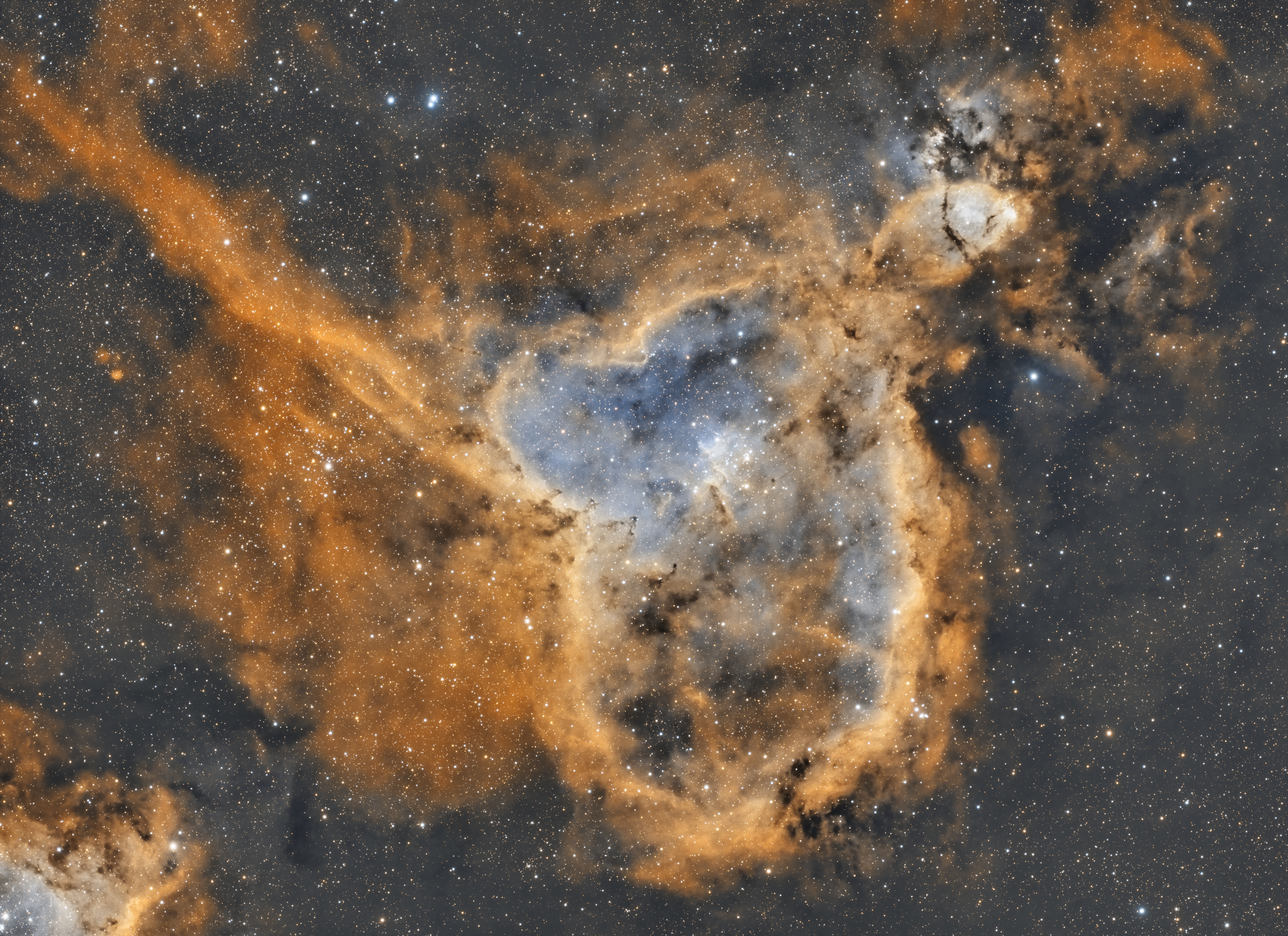IC 1805 – widely known as the Heart Nebula – is a vast emission nebula and star-forming H II region in the constellation Cassiopeia. What we see as a red, glowing cloud is hydrogen gas ionised by intense ultraviolet radiation from a young cluster of hot, massive stars (the open cluster Melotte 15) embedded near its centre. IC 1805 is part of the broader W3/W4 star-forming complex in the Perseus Arm, a region where stellar birth, feedback, and the reshaping of the interstellar medium happen on truly dramatic scales.