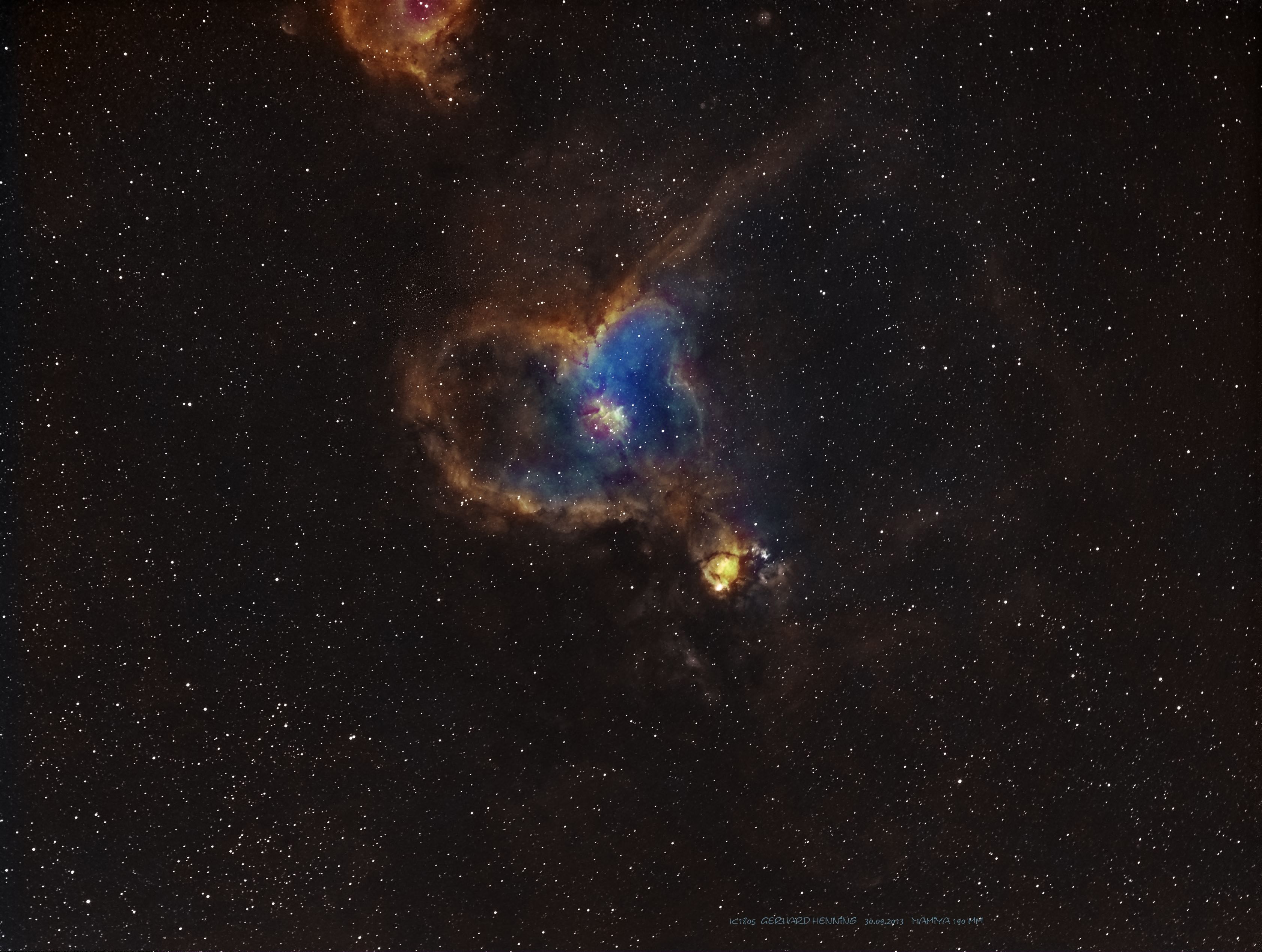 Im Sternbild Casiopeia befindet sich ein Wasserstoffemissionsnebel mit einem Sternhaufen.