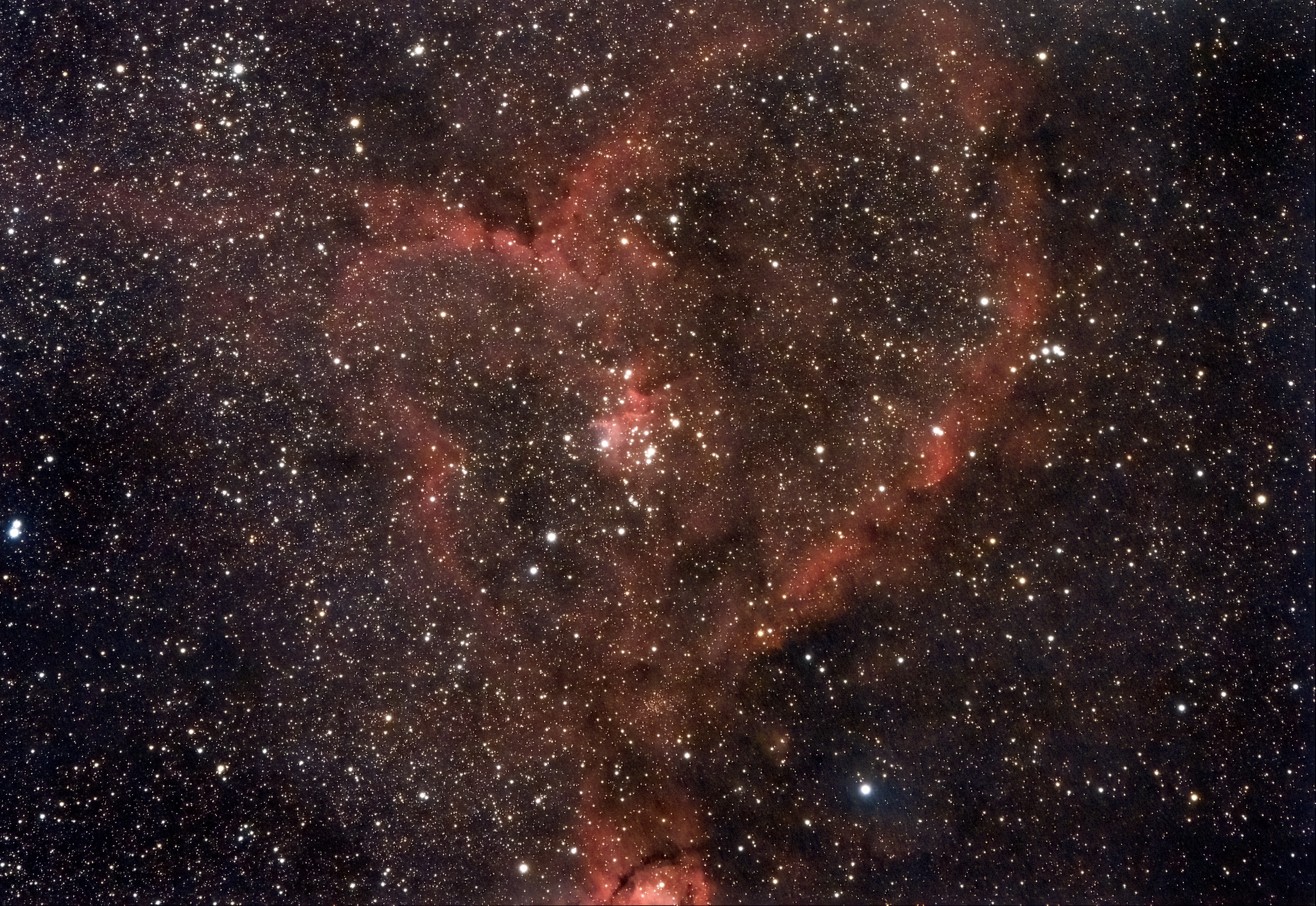 Der Herznebel im Sternbild Kassiopeia.Im Zentrum der offene Sternhaufen IC 1805. Entfernung 7500 Lichtjahre, entdeckt von Wilhelm Herschel. Gelegen im Perseus-Arm der Milchstraße.
