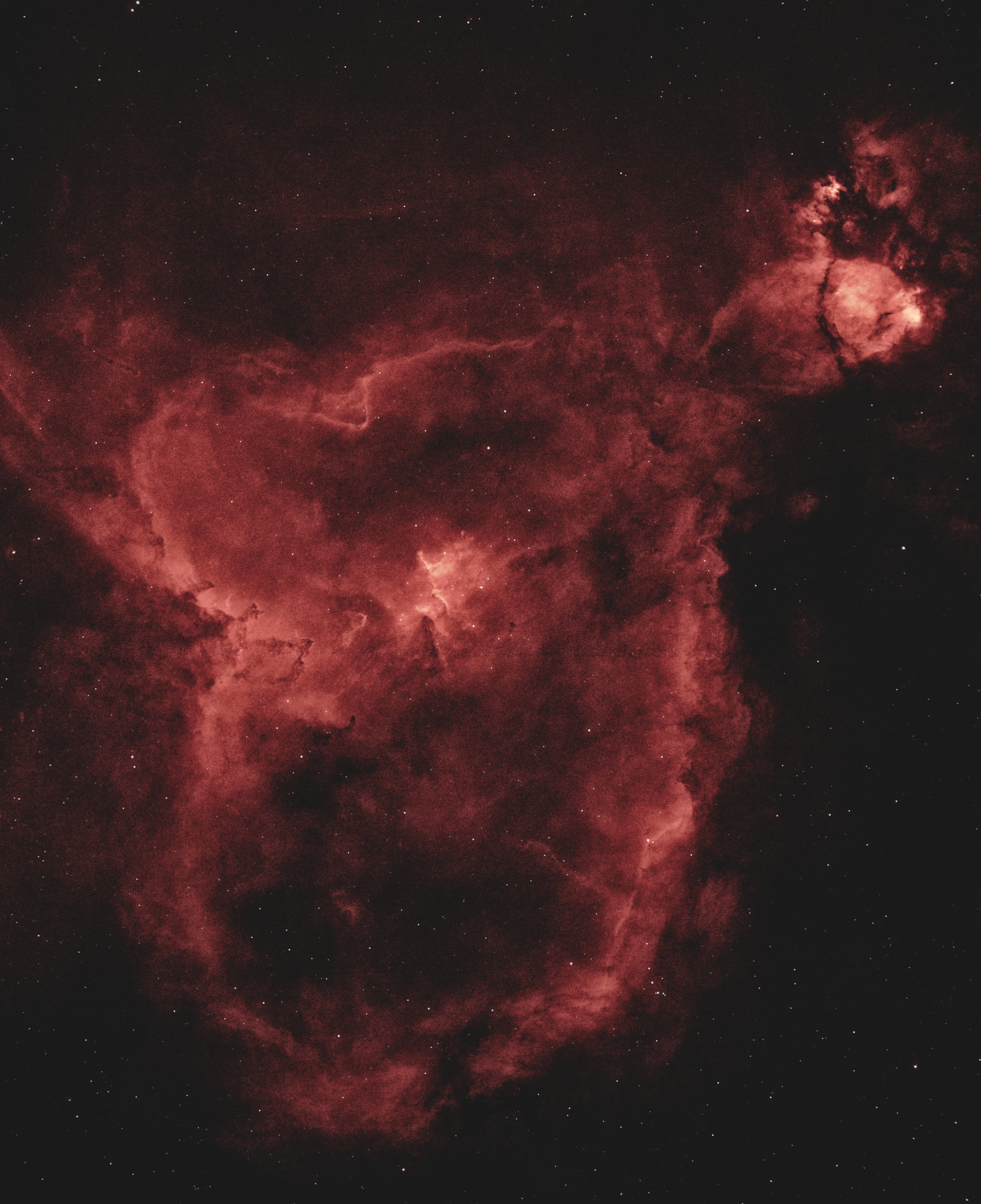 Nach diesem sehr verregneten Sommer versucht man jede größere Wolkenlücke zu nutzen, selbst mit störendem Mondlicht können heute schon gute Aufnahmen gelingen. Mit dem L-Extreme Filter gelang mir mein erstes Mosaik. Der Herznebel hat eine Ausdehnung von etwa einem Grad und erfordert damit entweder geringe Brennweiten oder eben ein Mosaik aus mehreren Bilden. Bei Benutzung von Teleobjektiven habe ich immer wieder Probleme, den richtigen Fokus zu erwischen, daher wollte ich diesmal lieber ein Mosaik aus zwei Teilen versuchen. Aus je 42 Aufnahmen mit 5 Minuten Belichtungszeit entstand diese Aufnahme mit insgesamt 7 Stunden Aufnahmezeit. IC 1805 ist ein dankbareres Objekt, wo man auch bereits mit wenigen Stunden Belichtung brauchbare Ergebnisse erzielen kann.