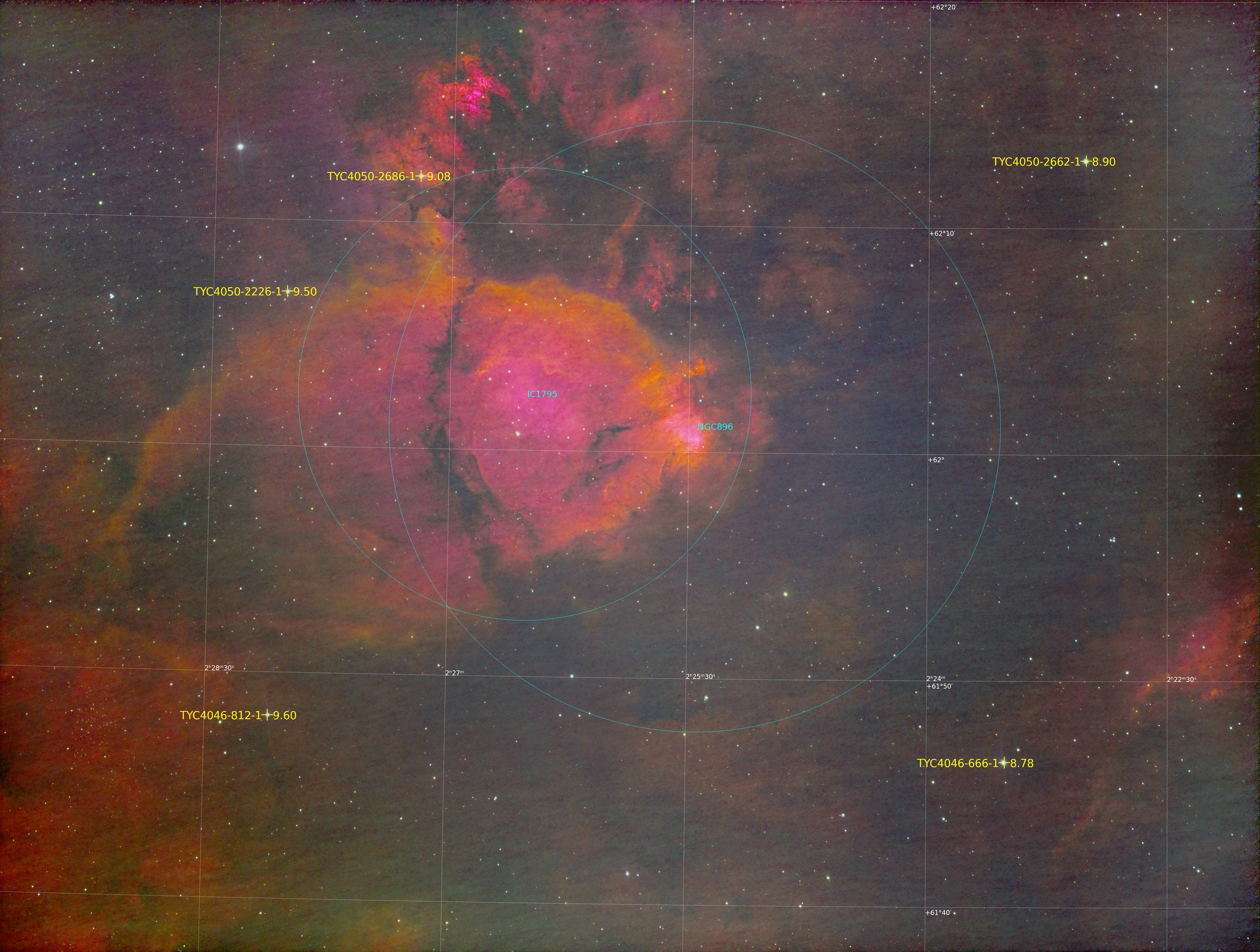 Der Herznebel am 17. Januar 2025 aufgenommen mit Schmalbandfiltern liegt im Sternbild Kassiopeia. Die Temperatur in diesem Emissionsnebel liegt bei etwa 10000 Kelvin.
