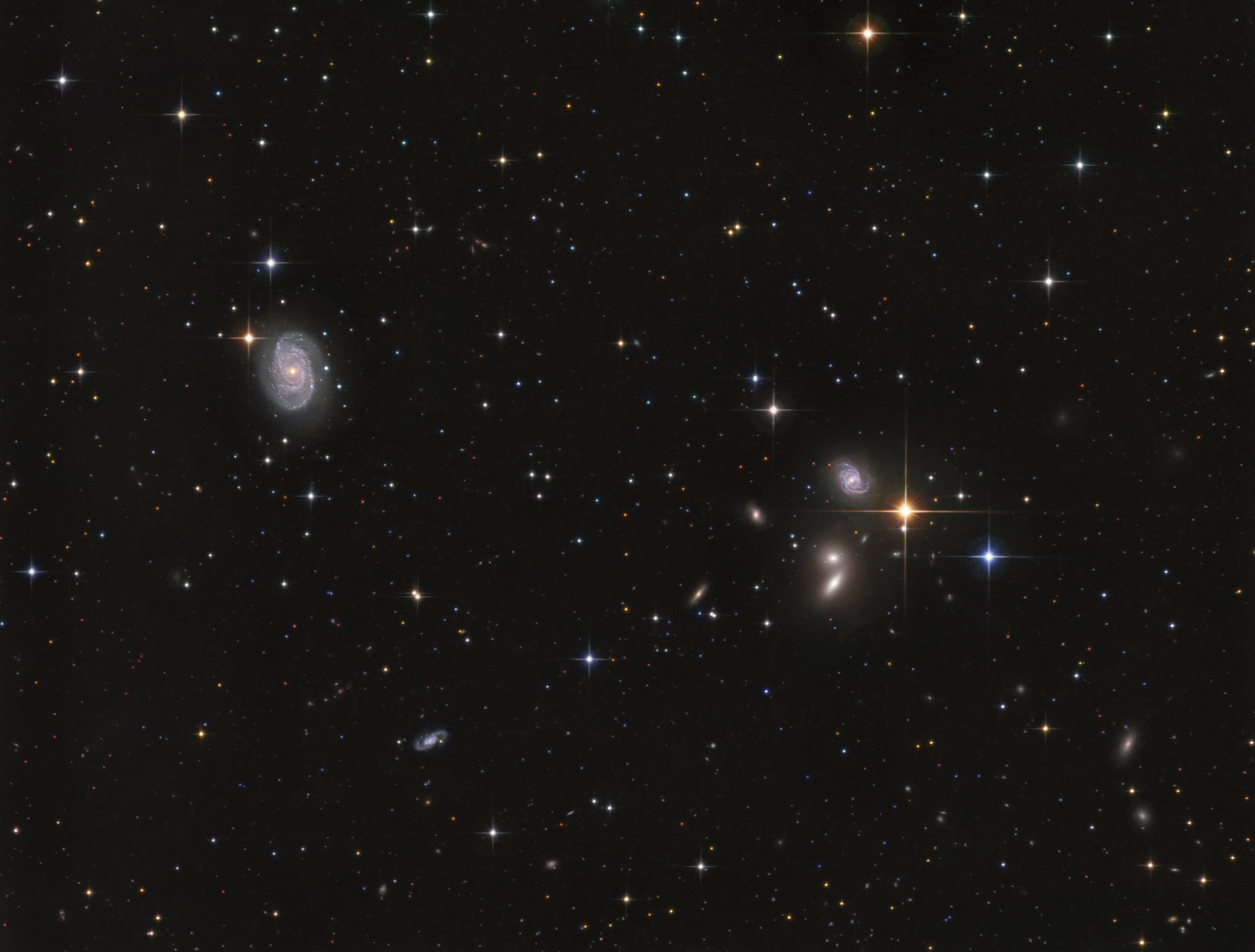 Die interessante Galaxiengruppe Hickson 68 befindet sich im Sternbild Jagdhunde. Die Galaxiengruppe, die aus NGC 5350, NGC 5353, NGC 5354, NGC 5355 und NGC 5358 besteht, ist rund 100 Millionen Lichtjahre entfernt. Links im Bild befindet sich die Balken-Spiralgalaxie NGC 5371, die aber selbst nicht zu Hickson 68 gehört. In der Aufnahme sind viele kleinere Hintergrundgalaxien zu sehen, unter anderem hat sich ein sehr weit entfernter Quasar ins Bild geschlichen. (s. Objektidentifizierung). Weitere Informationen und Bilder: http://galaxyphoto.de/de/hickson68-de/