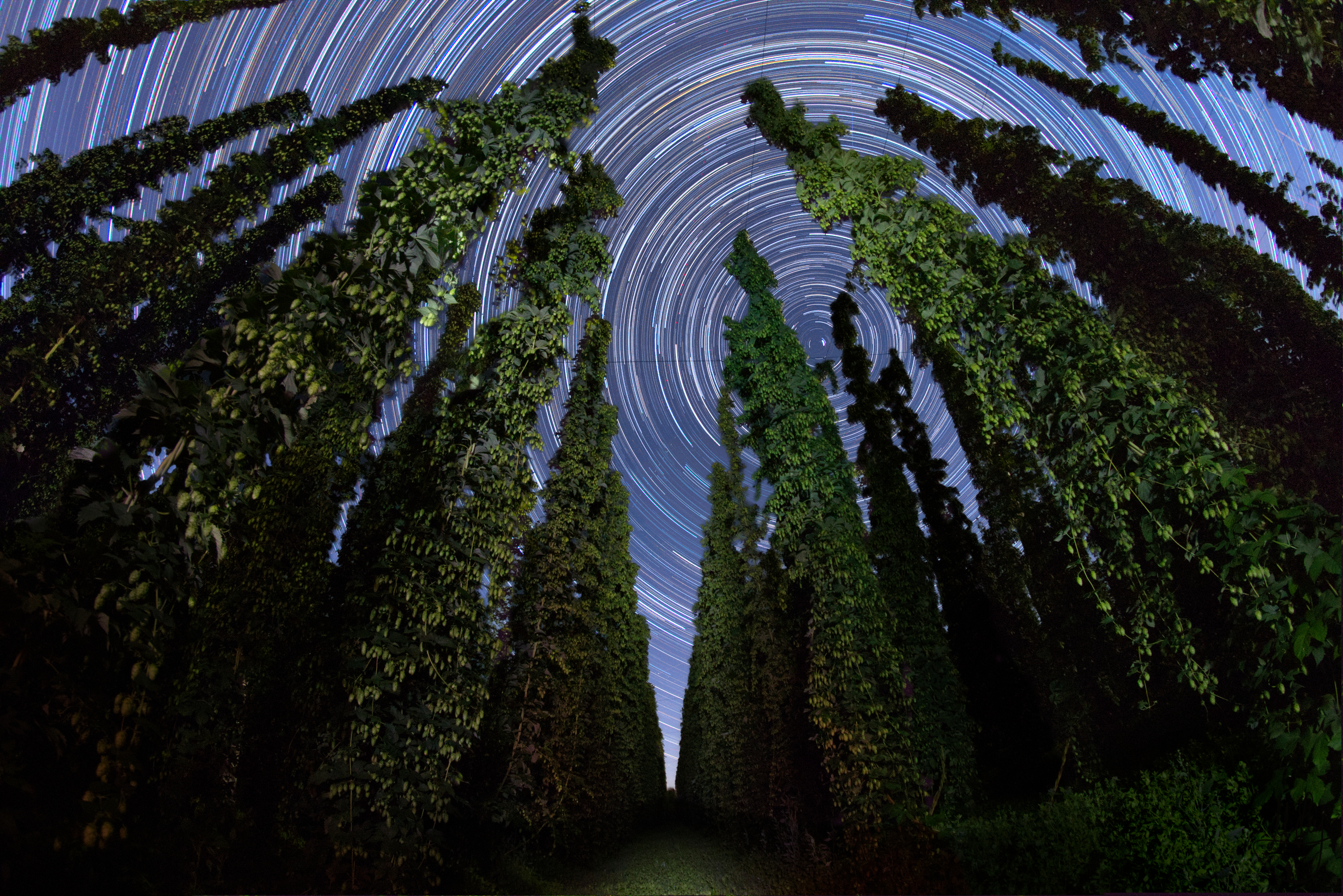 Wenn sie gerne Bier trinken oder gar Bierbrauer sind, dann kommen sie an dieser Pflanze mit ihren bitteren Früchten nicht vorbei. Nahe der Gemeinde Holsthum im romantischen Tal des Flüsschens Prüm im Naturpark Südeifel findet man das grüne Gold, aus dem so mancherlei Bierträume gemacht sind. Hier baut der einzige hauptberufliche Hopfenbauer in Rheinland-Pfalz den Siegelhopfen für eine weltbekannte, ebenfalls in der Südeifel ansässigen Bierbrauerei an. Denn die anspruchsvolle Kulturpflanze findet hier im Tal der Prüm die besten Bedingungen, um ihre volle Pracht zu entfalten. So gedeihen hier Hopfenarten wie der Aroma-, der Bitter-, oder der Hallertauer Hopfen. In dieser klaren Nacht stehe ich inmitten der beeindruckenden Rankenpflanzen und lasse die in Richtung Himmelsnordpol ausgerichtete Kamera über zwei Stunden belichten. Heraus kommt diese Startrail-Aufnahme inmitten einer wunderschönen Kulturlandschaft mit –zugegeben- bitterem Beigeschmack. Die Pflanzen wurden mit einer Handlampe ausgeleuchtet.