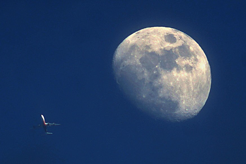 ... deutlich wird, dass ein Teleobjektiv von Vorteil gegenüber einem Teleskop sein kann: Man kann das Motiv wesentlich schneller kommen sehen und erfassen. Ebenfalls am Abendhimmel, wie beim vorigen Bild, allerdings älteren Datums. Dieses Mal ein Telezoom mit effektiv 305 mm Brennweite. (Min. 25 Jahre alt - Minolta.)