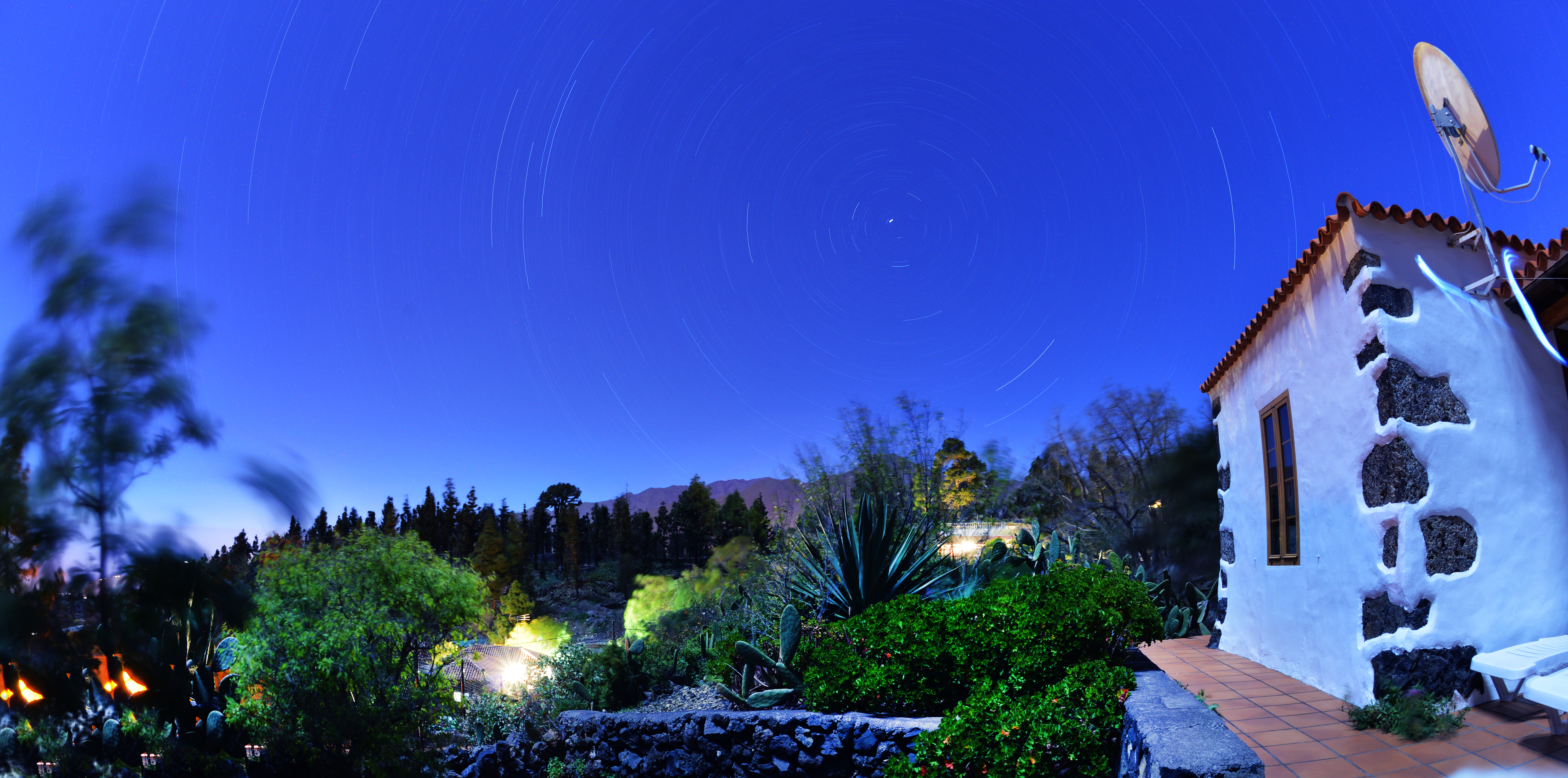 Zeitaufnahme mit dem Polarstern mit der Landschaft von Tacande, lediglich beleuchtet vom Mondlicht.