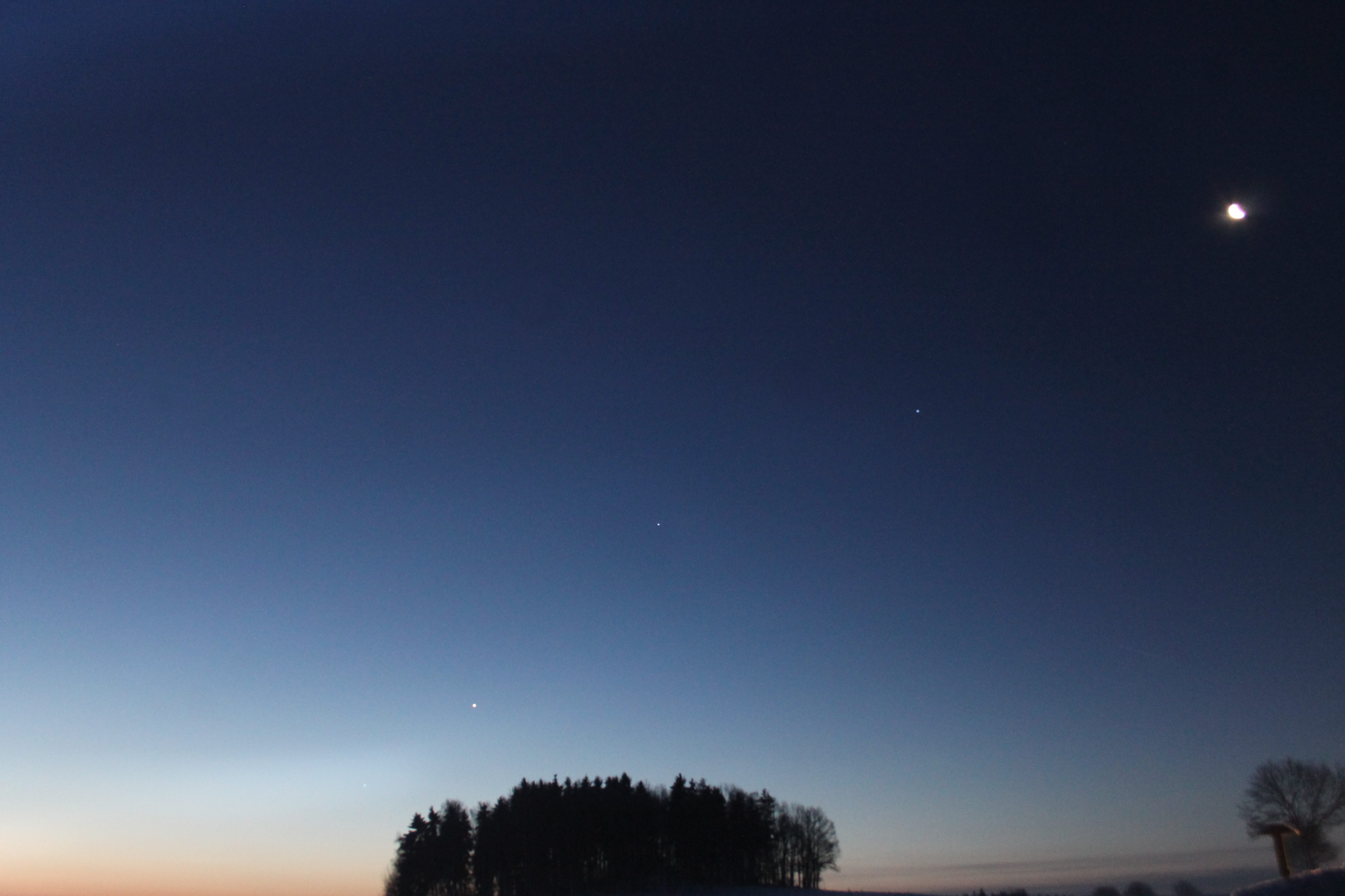 Merkur (im Dunst), Venus, Jupiter, Spica und Mond am 8.12.2012 bei Gelenau (Erzgebirge) bei -22,5°C um 6:42 Uhr, Höhe des Aufnahmeortes ca. 600m