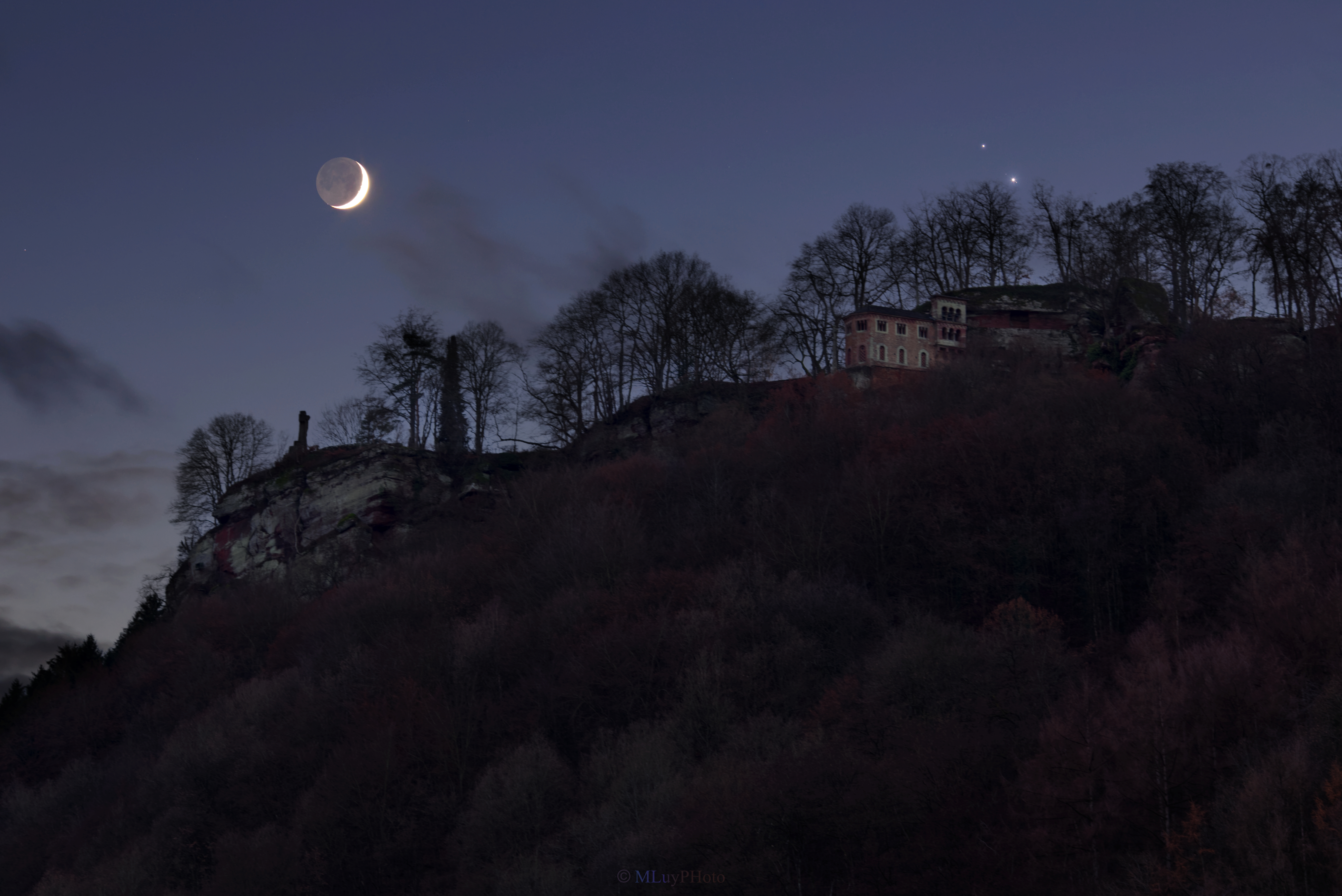 Nach wochenlangem bedeckten Himmel hat es tatsächlich doch noch geklappt. Die schöne Konstellation vom Abend des 17. Dezember 2020 von schmaler Mondsichel und den Gasplaneten Jupiter und Saturn konnte über der Grabkapelle bei Serrig festgehalten werden. Hier, auf einem Felsvorsprung hoch über dem Saartal liegt die Klause von Kastel-Staadt aus dem 17. Jahrhundert. König Friedrich Wilhelm IV. lies die Anlage 1833 von Karl Friedrich Schinkel zu einer Grabkapelle für den böhmisch- luxemburgischen König Johann den Blinden ausbauen. Er gestaltete den Aufbau mit Rundbogenfenstern, Säulenarkaden und einen Glockengiebel. Die Gebeine König Johann ruhten in der Klause seit 1838 bis sie 1946 in die Kathedrale zu Luxemburg überführt wurden. Am 21. Dezember findet sodann die große Konjunktion statt. Dann stehen die beiden Gasplaneten in der Abenddämmerung über dem südwestlichen Horizont so eng beisammen, das sie mit dem bloßen Auge kaum noch zu trennen sind.