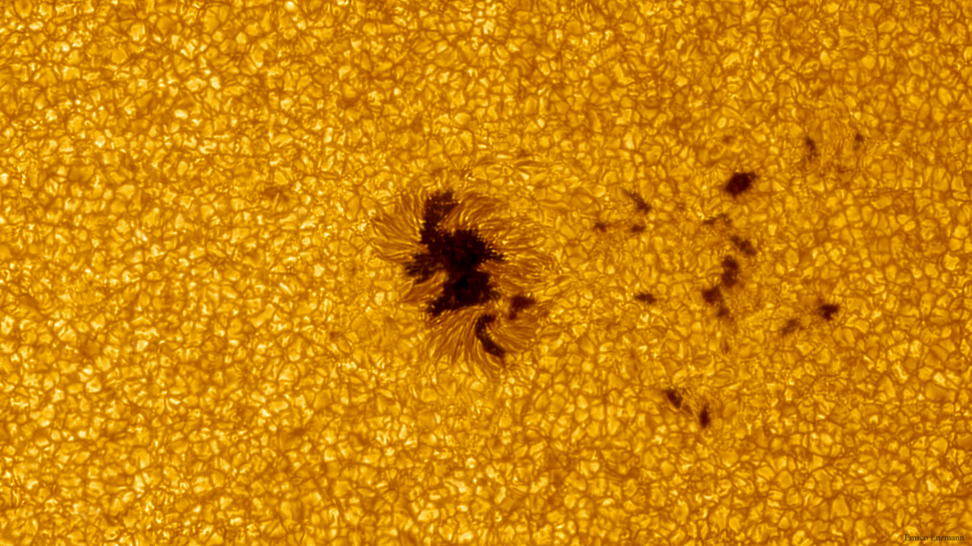 Heute war zeitweise das Seeing sehr gut und hat diese hochaufgelöste Aufnahme eines kleinen Sonnenflecks erlaubt. Auch die Granulation ist schön zu sehen.