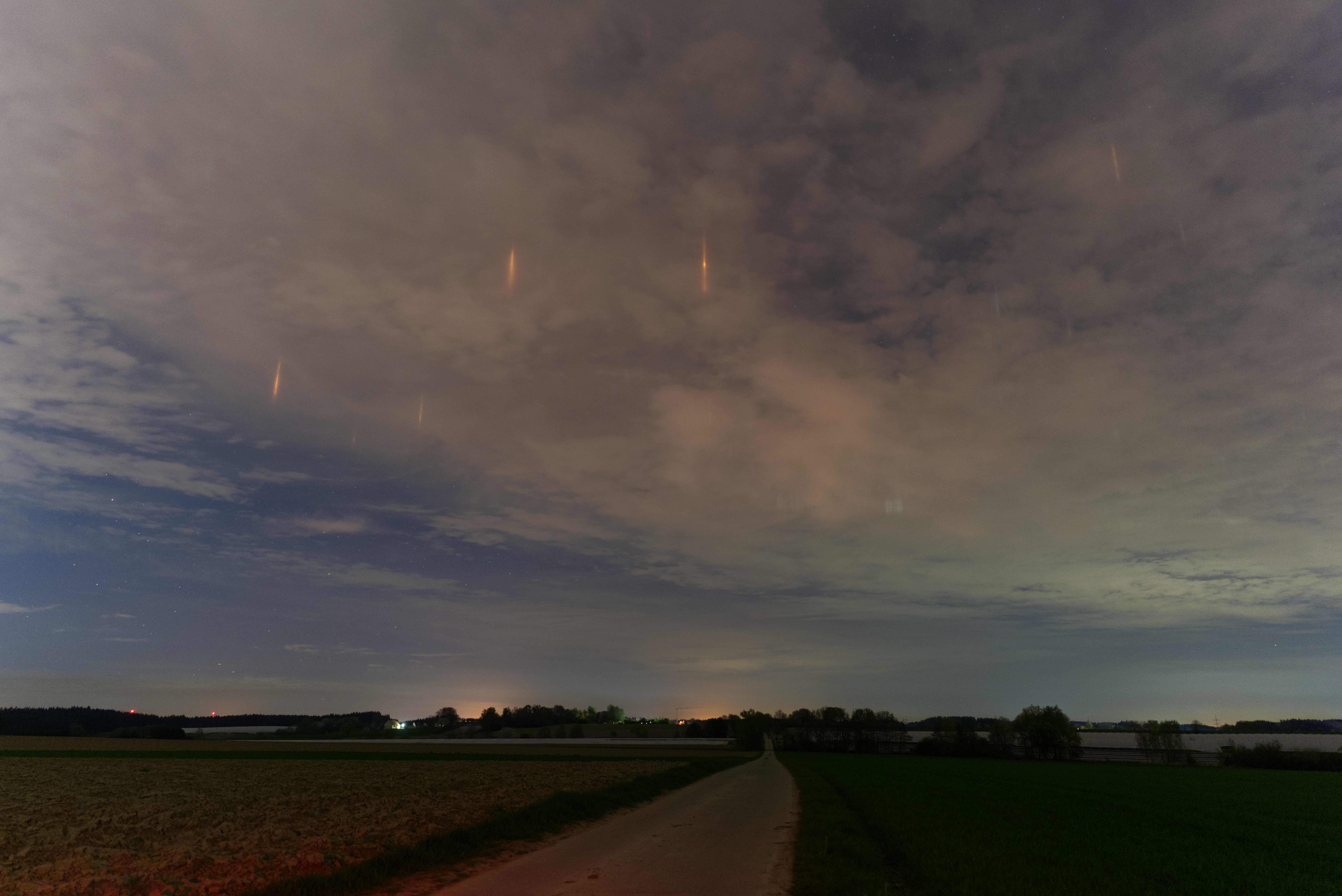 Eine Gruppe des Astro Treff München Nord wollte ein neues Großfernglas testen. Als alles aufgebaut war, zog sich der Himmel zu. Kurze Zeit später zeigten sich diese schönen Hohen Lichtsäulen am Himmel. Vielleicht verursacht durch die riesigen Osterfeuer in der weiten Umgebung oder auch nicht. Die Lichtsäulen waren auf jeden Fall sehr sehenswert.