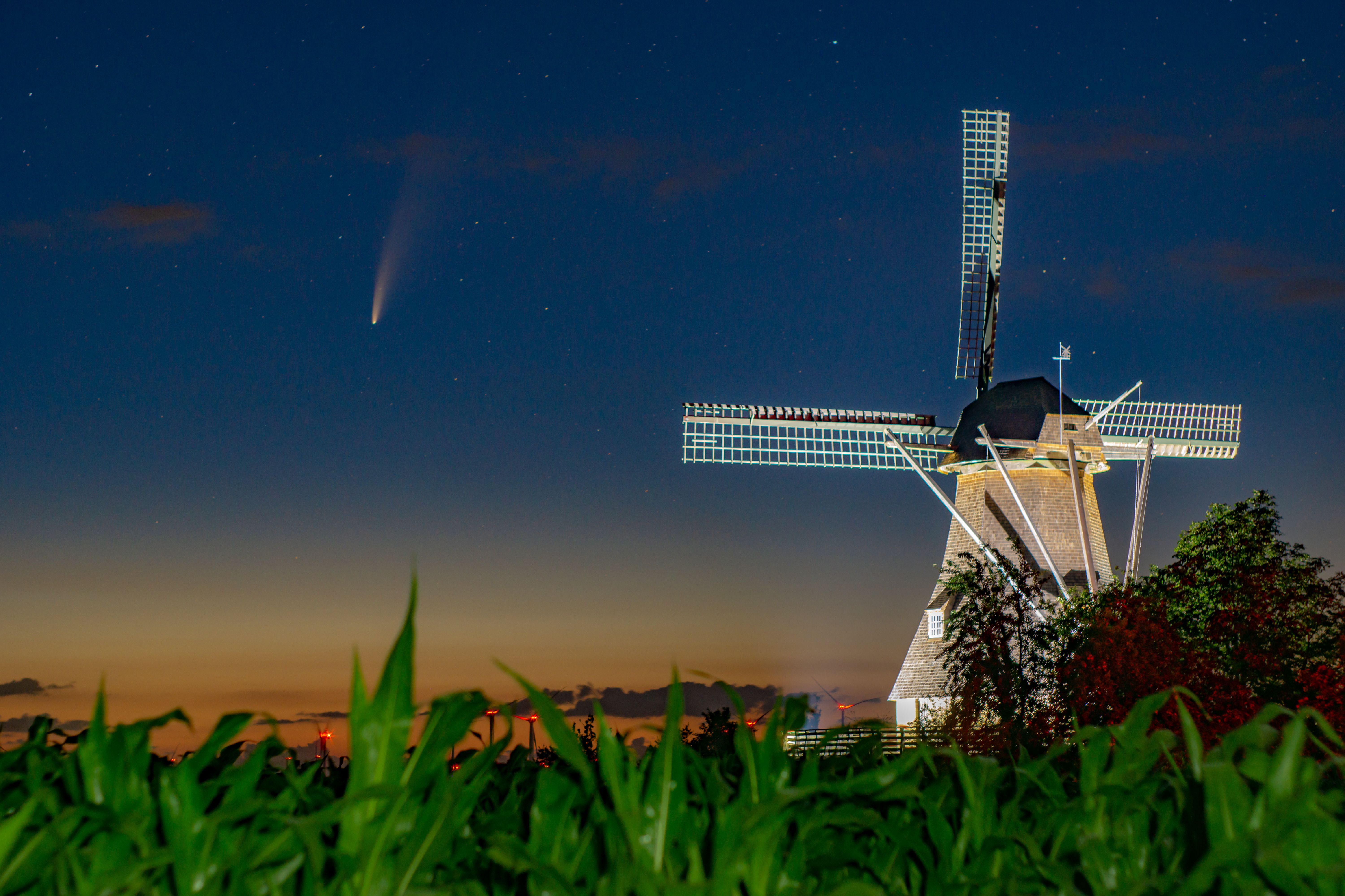 Ich habe dieses Bild in der Nacht zu Sonntag um halb 4 geschossen. Es zeigt die Hollicher Mühle in Steinfurt mit dem Kometen Neowise.