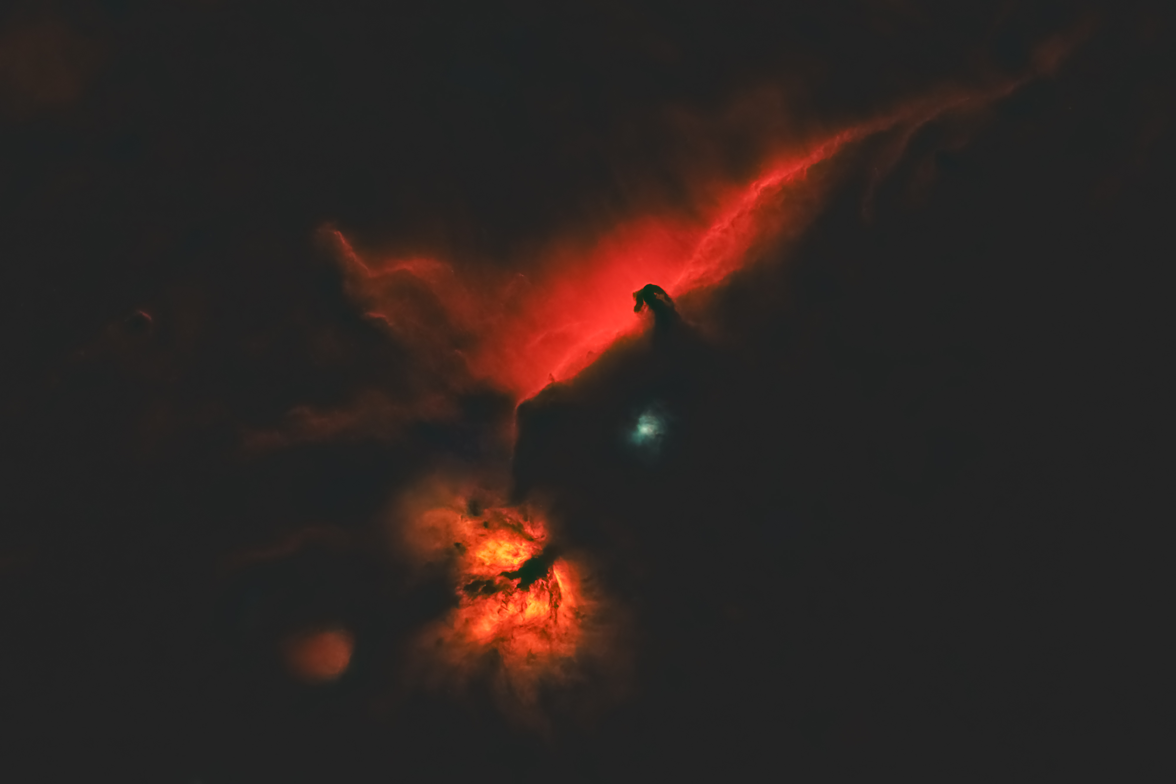 Horsehead and Flame. These are the names of two iconic nebulae located around the star Alnitak in Orion's belt. I present them to you in a starless version, with a reddish hue resulting from an image taken with an H-alpha- and OIII-filters, then processed in a non-classical manner, but with a touch of creativity. It's an area of the sky that has always fascinated me, and one I wanted to give my own touch. I hope you like it 😊