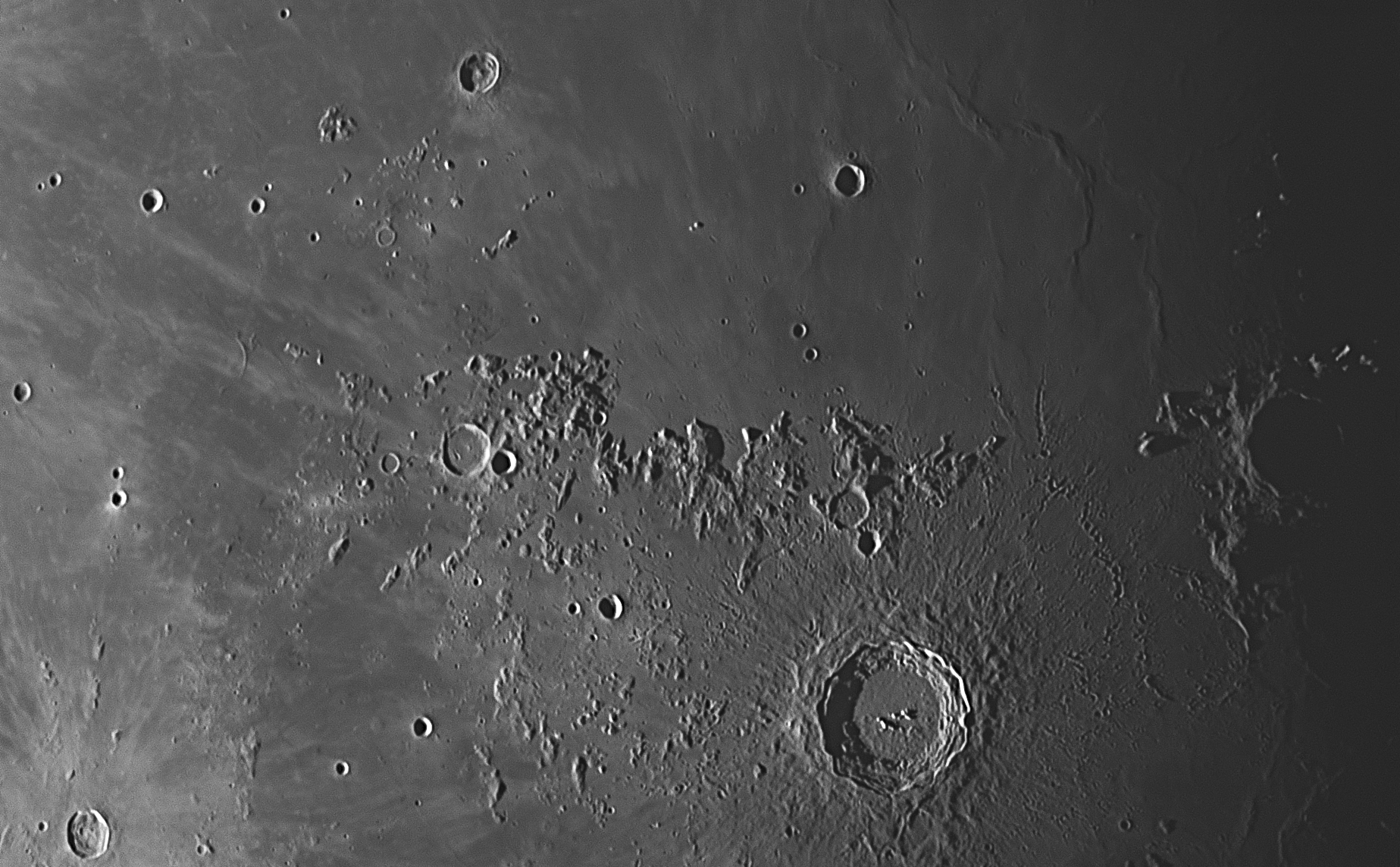Links neben Kopernikus zeigen sich winzig die Hortensius-Dome mit kleinen Gipfelkratern (1,5 km Durchmesser). Sie gehören zu den vulkanischen Erhebungen auf dem Mond.