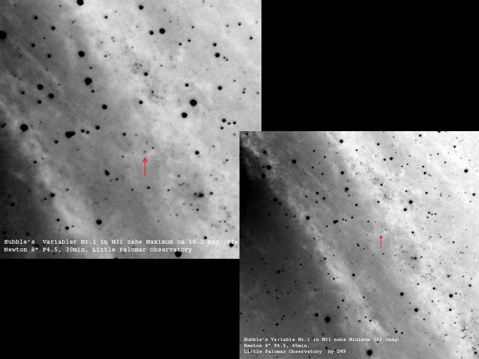 Der Var. 1 mit seiner Entdeckungsgeschichte faszinierte mich seit langer Zeit. Bereits 2006 hatte ich ihn als einer ersten Objekte meiner CCD-Tätigkeit aufgenommen. Ich war begeistert, dass er bereits nach 15 min Expositionszeit mit dem 8" Newton zu erkennen war (Aufnahme mit dem 2,5-Meter-Hooker-Teleskop mit 45 Minuten Belichtungszeit, was für ein gewaltiger Fortschritt mittels der CCD-Technologie!). Um seine Veränderlichkeit nachzuweisen habe ich ihn bei jeder Gelegenheit aufgenommen, bisher annähernd 40 Mal. Aber nur einmal (!!!) gelang es mir, an die Maximumshelligkeit heranzukommen! Das liegt an der Form der Lichtkurve. Der Anstieg zum Maximum erfolgt innerhalb von zwei Tagen. Fünf Tage dann bis zum Abfall nahe zur Minimalhelligkeit, bei der er fast 18 Tage verharrt. Bei den Wetterbedingungen in Mitteleuropa mit Vollmond, Wolken, Nebel ein Lotteriespiel! Man bedenke die Leistung von E. Hubble; dieses Lichtpünktchen visuell zu entdecken, nahe dem hellen Zentrum von Messier 31 und der gewaltigen Ausdehnung von diesem in alle Richtungen. Zweitens die Bestimmung der Form Lichtkurve und ihrer Periode innerhalb kurzer Zeit (Anwendung der Fourier-Analyse).