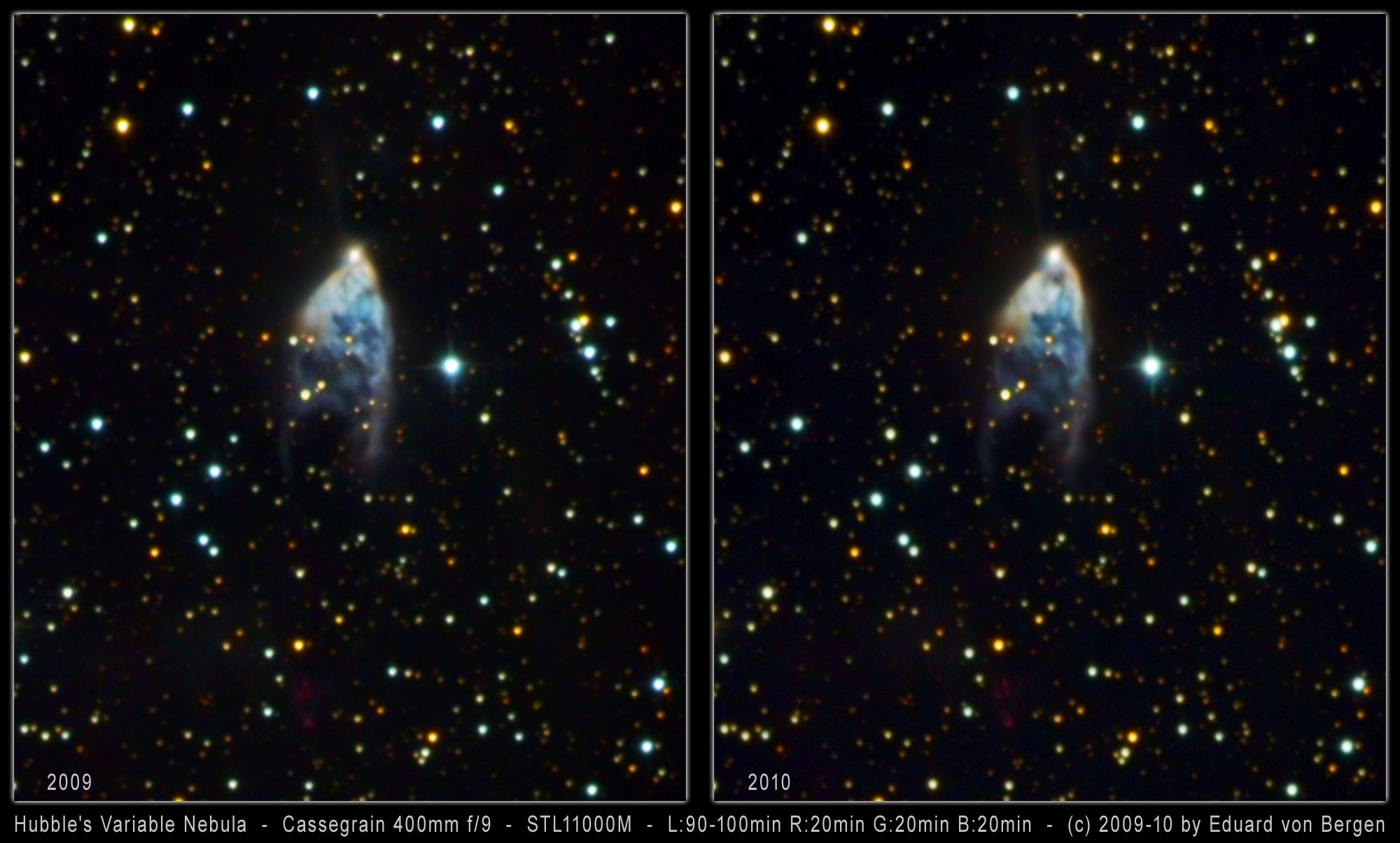 Bereits nach einem Jahr zeigt sich in Hubbles Veränderlichem Nebel NGC 2261 erste gut sichtbare Abweichungen in seinem Aussehen.