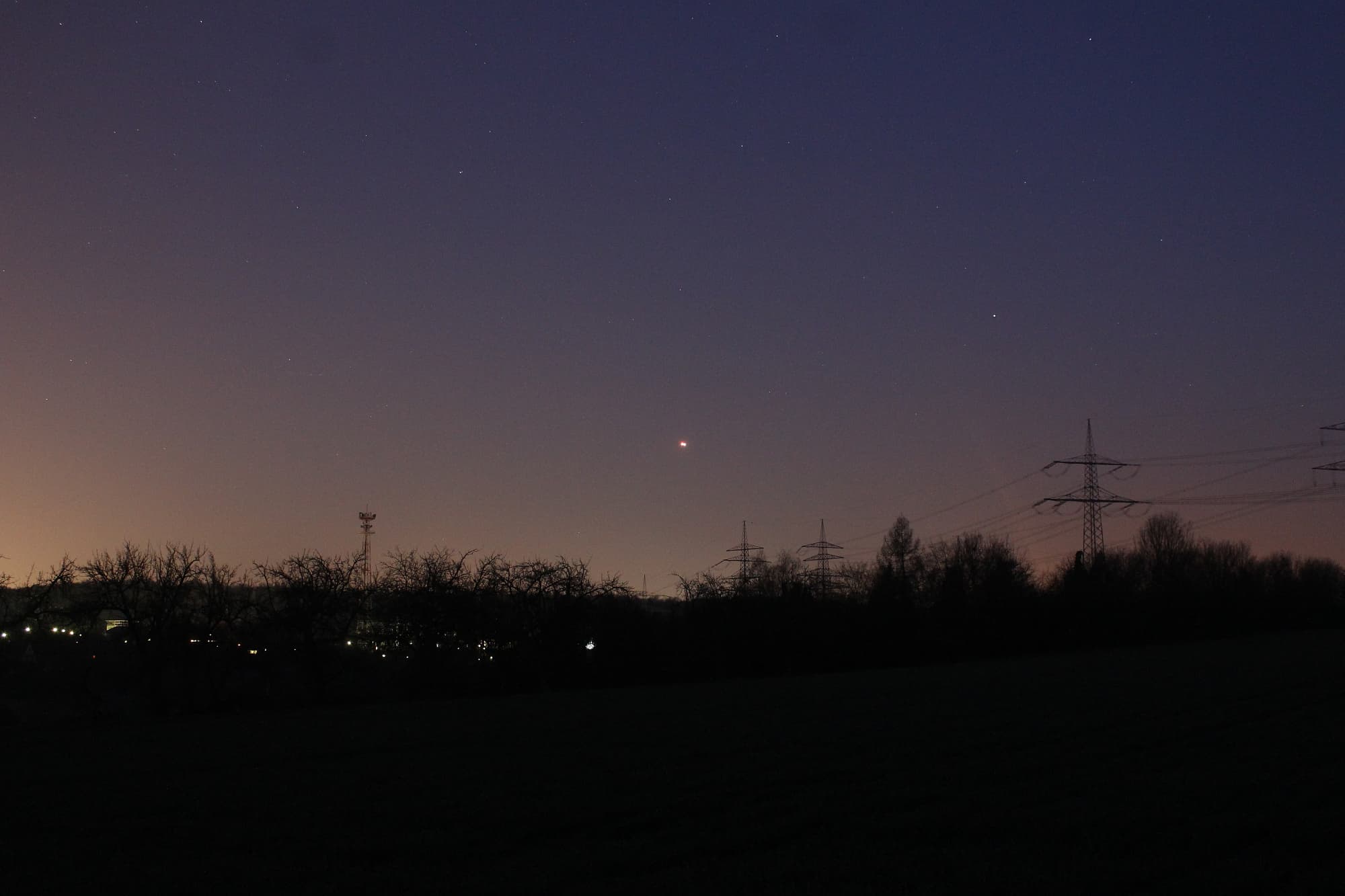zu Anbruch der Morgendämmerung über dem westlichen Gebiet von Ludwigsburg. Im Vordergrund erkennt man einige Hochspannungsleitungen, die zum Umspannwerk Hoheneck führen. Der helle Stern im rechtem Bildteil ist Spika.