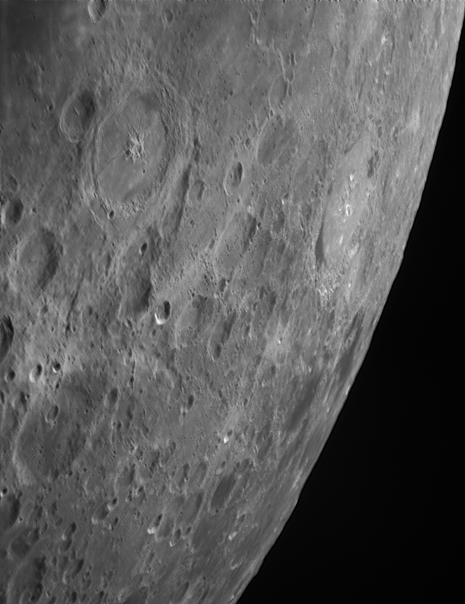 Auch der Bereich der Wallebene Humboldt profitierte noch von der günstigen Libration am 18. Juli 2018. Dadurch ließen sich auch die östlich davon liegenden Krater Barnard und Abel gut beobachten.