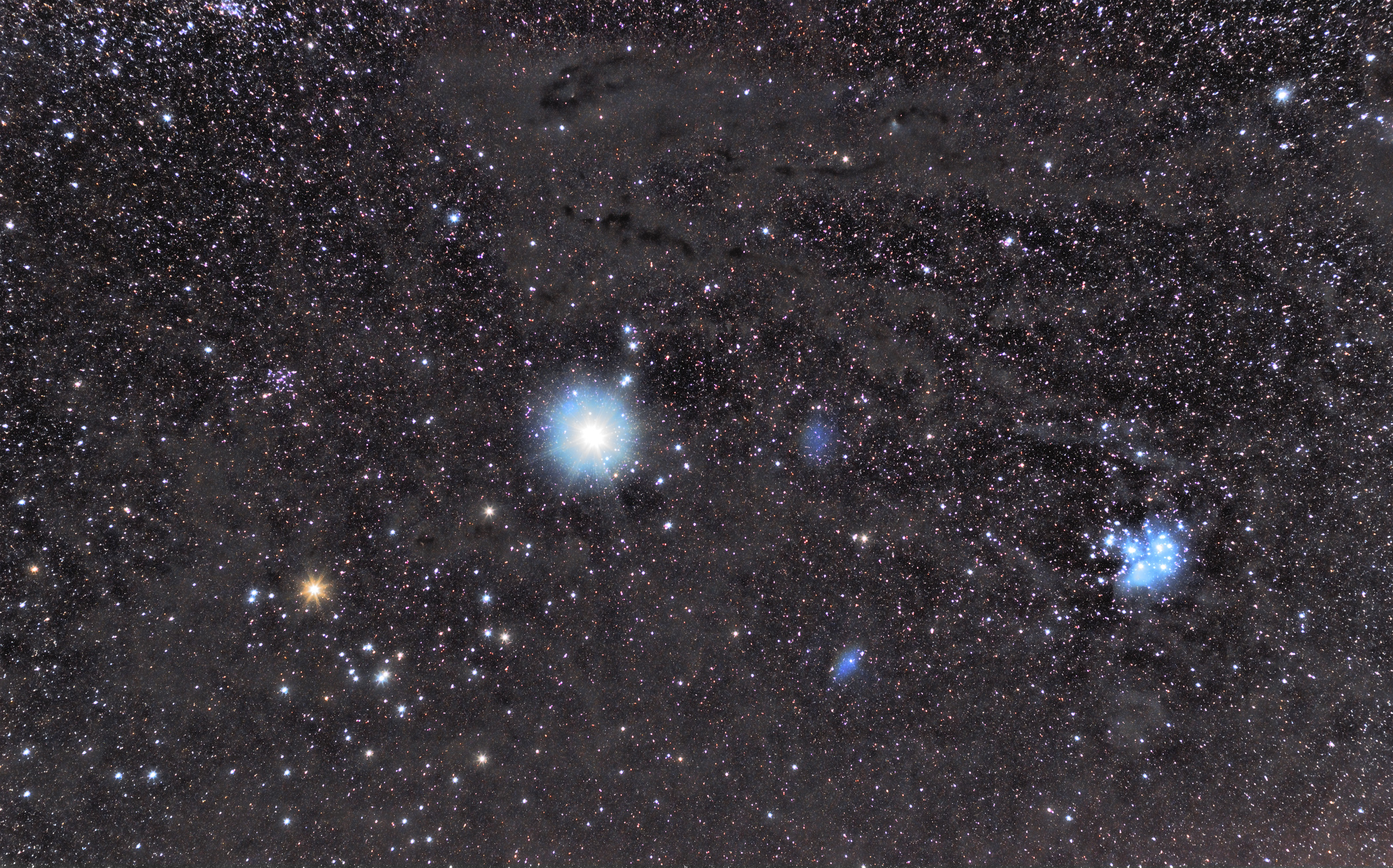 Anfang März hat das Wetter mal wieder gepasst, so dass wir raus aufs Feld gefahren sind, um ein paar Photonen zu sammeln. Leider war es sehr windig, darum haben wir uns für kleine Brennweiten entschieden und beide dasselbe Objekt abgelichtet, um eine bessere Tiefe zu erreichen. Am nächsten Abend waren die Bedingungen ähnlich, so dass wir am Projekt weiter arbeiten konnten. Leider haben sich durch das Canon-Objektiv mit 50 Millimeter Brennweite zwei blaue Reflexe zwischen Jupiter (Bildmitte) und den Plejaden eingeschlichen, die wir aber drin gelassen haben, da wir die Aufnahme nicht selektiv bearbeiten wollten. Astrokooperation mit Patrick Richter.