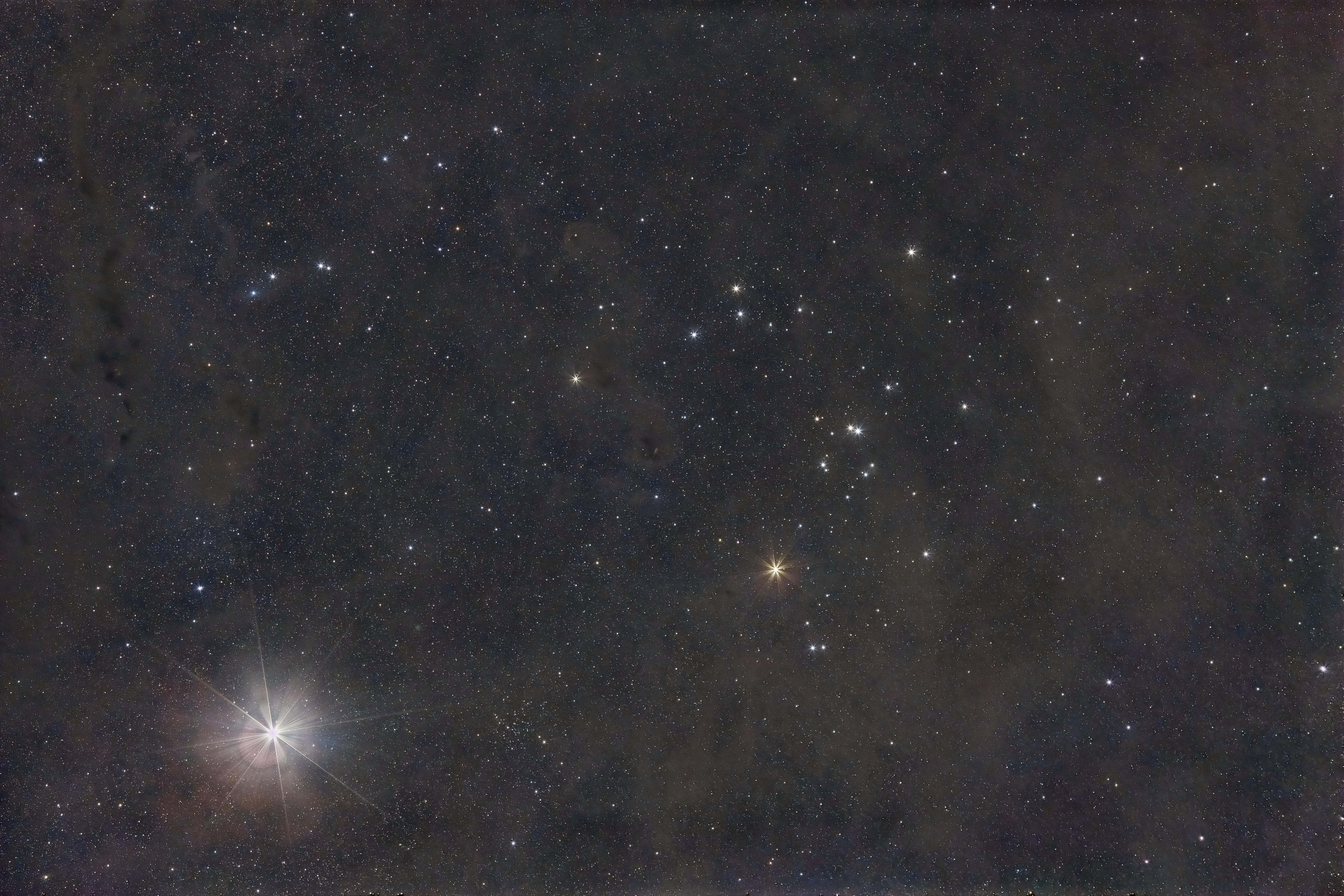 Am 2. Weihnachtsfeiertag gab es für Astrofotografen ja ein schönes Geschenk in Form von wunderbar klarem Nachthimmel. Währen mein Teleskop den Orionnebel belichtete, hat meine DSLM fleißig Aufnahmen von den Hyaden und den alles Überstrahlenden Jupiter aufgenommen. Jupiter, der momentan im Sternbild Stier steht war so strahlend hell, dass ich bei der Bildbearbeitung Probleme mit Linsenreflexen hatte. Trotzdem sind die Dunkelwolken der Taurus Molekülwolke einigermaßen gut zu erkennen.