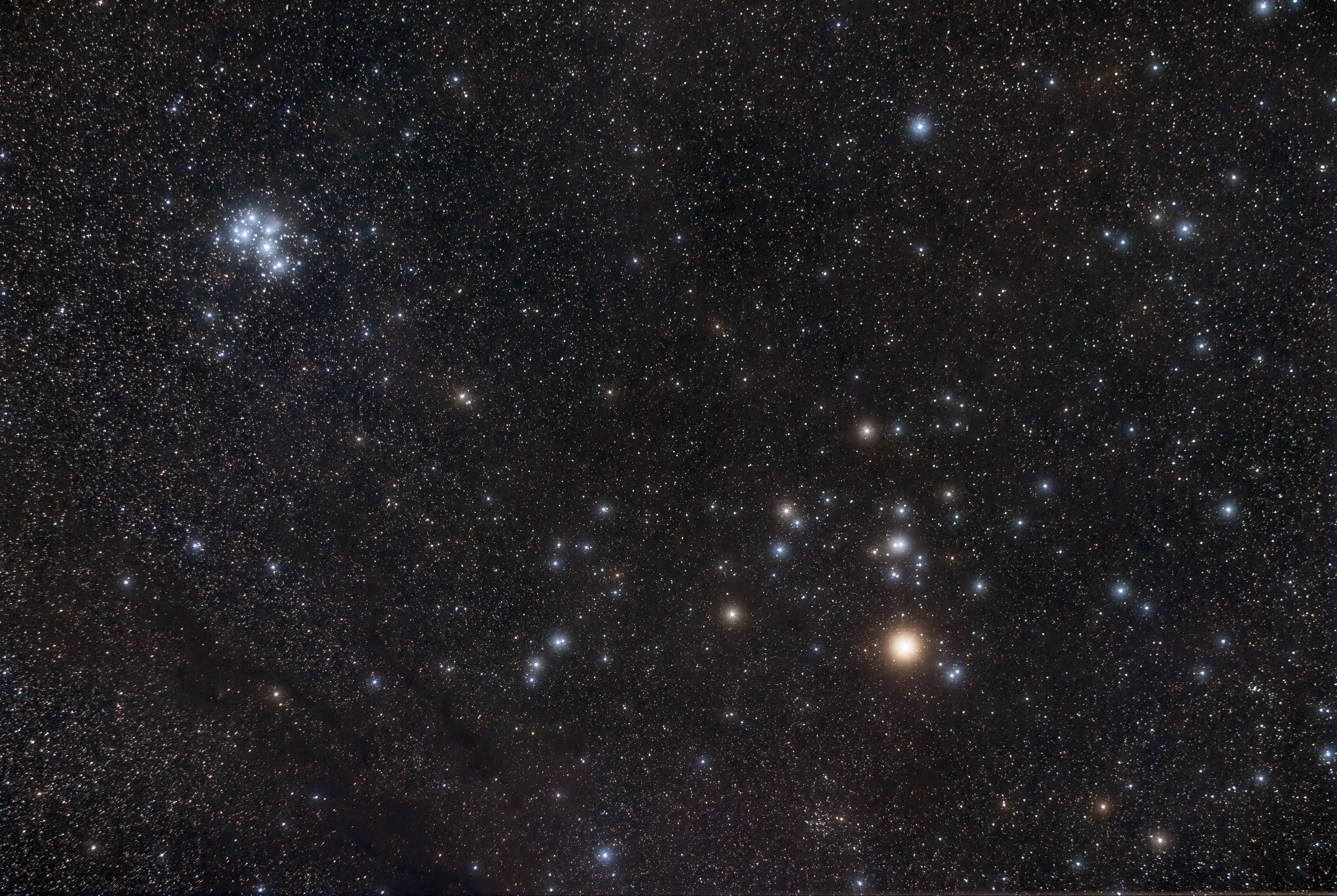 Widefield der Hayden und Plejaden im Sternbild Stier. Leider schlechtes Seeing und auch nur kurz mal ein paar Wolkenlücken, so das es nur für ein Stunde Belichtungszeit gereicht hat.