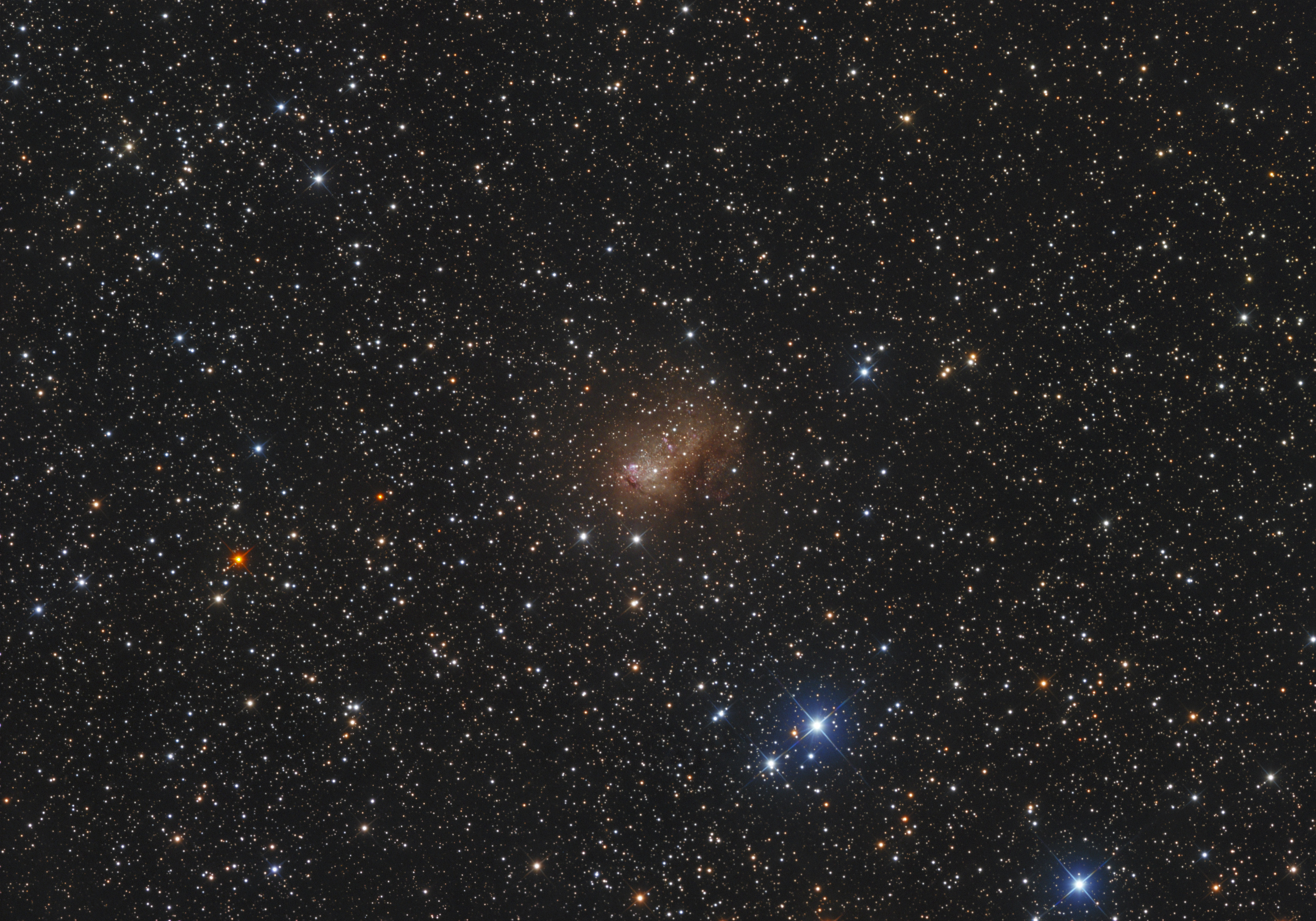 Nach längerer wetterbedingter Durststrecke konnte ich endlich wieder ein astronomisches Bild fertigstellen. IC 10 ist eine irreguläre Zwerggalaxie im Sternbild Kassiopeia. Die Galaxie ist Teil der Lokalen Gruppe, der auch die Milchstraße angehört. Das IC im Namen steht für den Index-Katalog, einen Ende des 19. / Anfang des 20. Jahrhunderts veröffentlichten astronomischen Katalog von galaktischen Nebeln, Sternhaufen und Galaxien. IC 10 ist eine sehr junge Galaxie mit aktiver Sternentstehung und die der Erde nächste Starburstgalaxie.