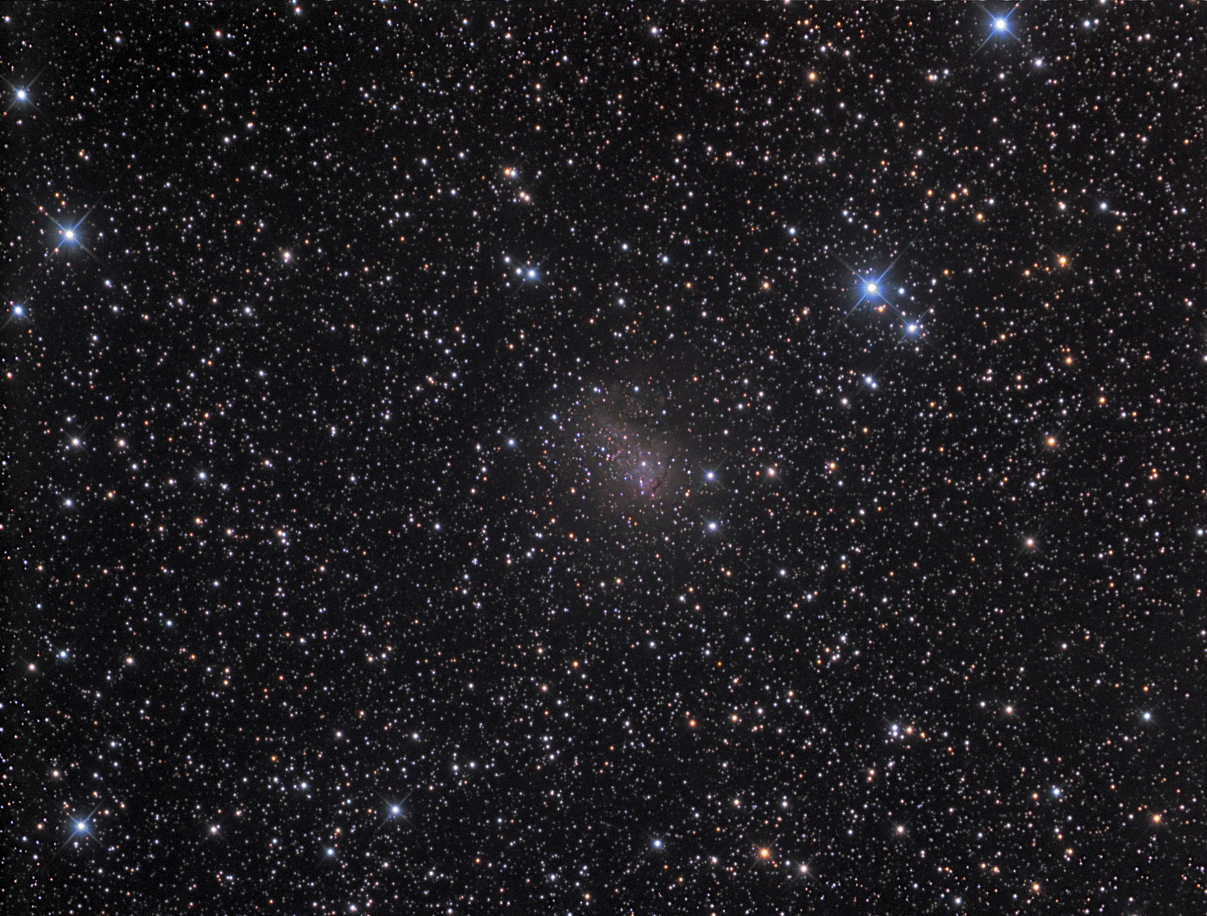 IC 10 ist eine kleine irreguläre Galaxie der lokalen Gruppe und etwa so weit entfernt wie die Andromedagalaxie. Sie steht mitten in der Milchstraße und wird durch vorgelagerten Staub stark gedämpft und gerötet. Nachdem ich in einer wunderbar klaren Nacht im August den Luminanzkanal aufnehmen konnte, musste ich auf eine Gelegenheit für die Farbaufnahmen über zwei Monate warten.