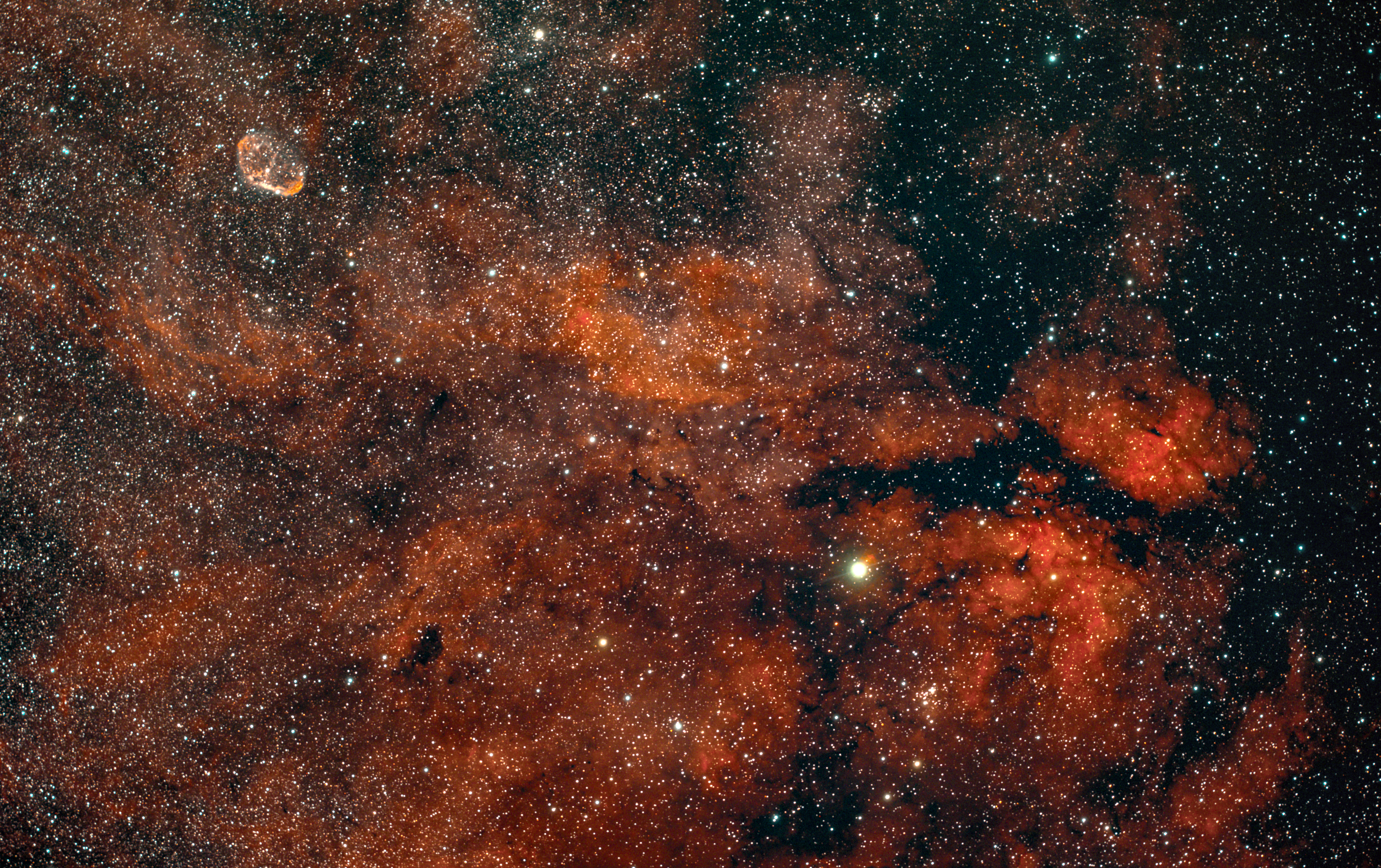 IC 1318 ist ein großer heller Nebel mitten im Sternbild Schwan. Am Rand gesellt sich noch NGC 6888 dazu. Aufnahme mit Astro Duo Narrowband Filter. Live gestackt mit SharpCap.