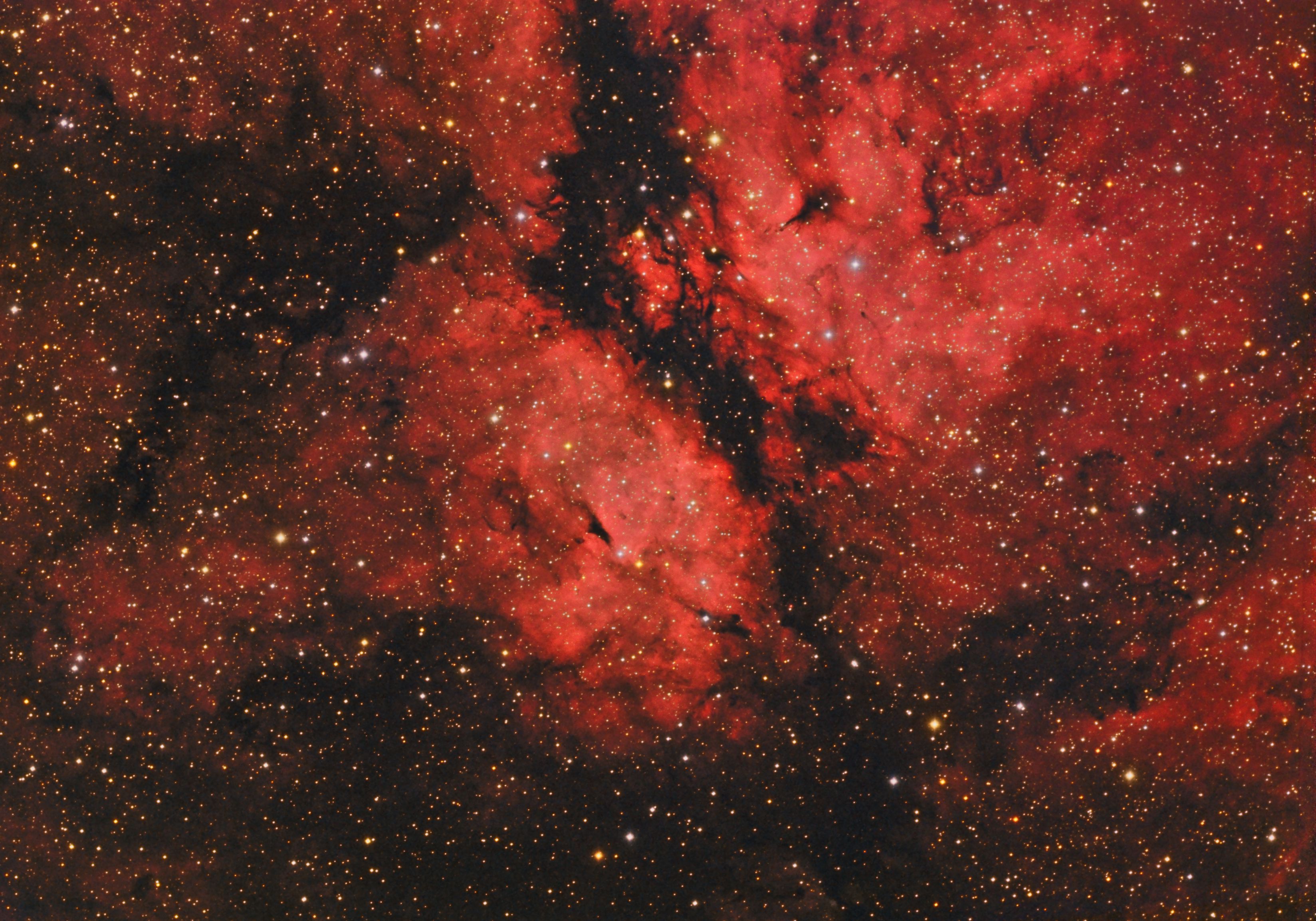Im Sternbild Schwan gibt es neben dem Nordamerikanebel noch eine weitere interessante Hα-Region – den Emissionsnebel IC1318. Tatsächlich handelt es sich bei IC1318 um 3 Objekte, die um den Stern Sadr (Gamma Cygni) herum angeordnet sind. Die Aufnahme zeigt IC 1318 B (rechts oben) und 1318 C (Mitte). Die beiden Emissionsnebel werden von der Dunkelwolke LDN 889 getrennt.