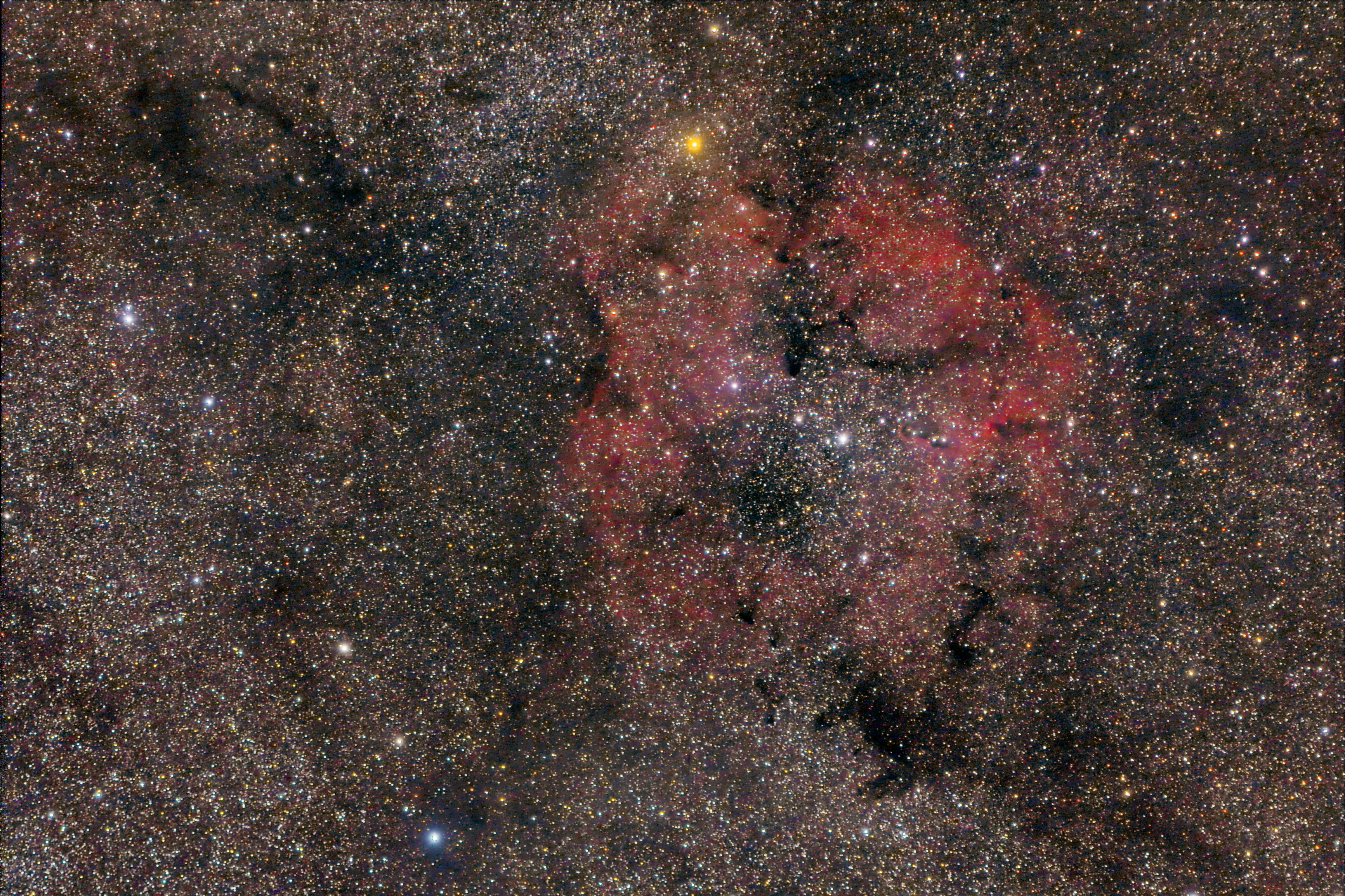 Alte Zutaten neu zubereite … Ich habe ein schon 3 Jahre altes Bild noch einmal bearbeitet. Der wunderschöne Emissionsnebel IC 1396 samt markanten Dunkelwolken im Kepheus im Sternenmeer des Milchstraßenbands. Zu erkennen ist auch der berühmte Elefantenrüsselnebel im rechten Teil von IC 1396 und der "Black Fish" ist der Dunkelnebelkomplex links oben im Bild. Das Bild ist ein Ausschnitt aus dem 150-mm-Feld.