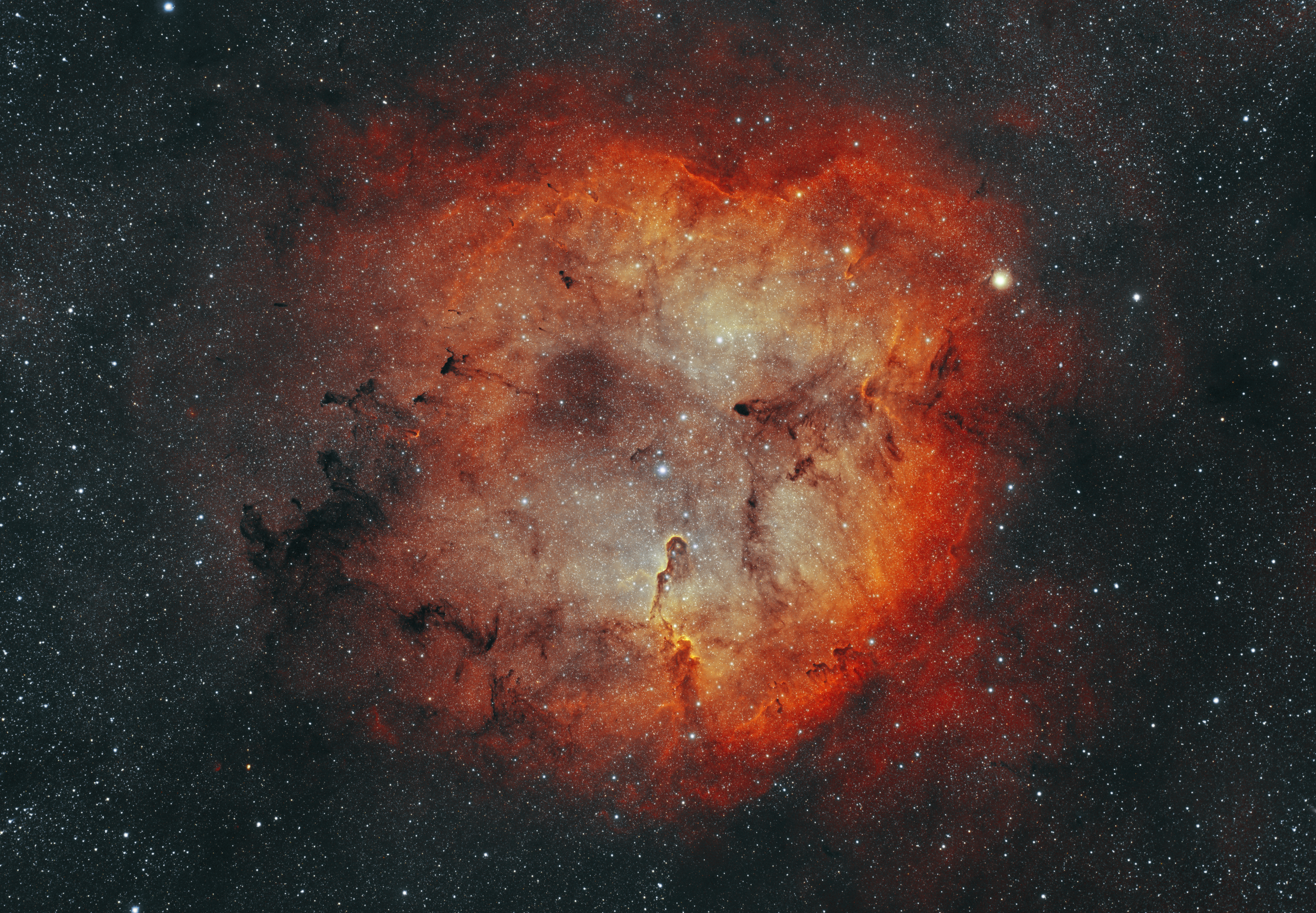 Diese Schmalband-Aufnahme von IC 1396 entstand an zwei klaren Septembernächten in Folge. Insgesamt konnte ich 7 Stunden Belichtungszeit sammeln. Aufgenommen wurde das Bild mit einem Duo-Narrowband-Filter und einer OSC-Kamera. Die H-Alpha- und OIII-Daten wurden mit PixInsight zu einem Farbbild verrechnet.