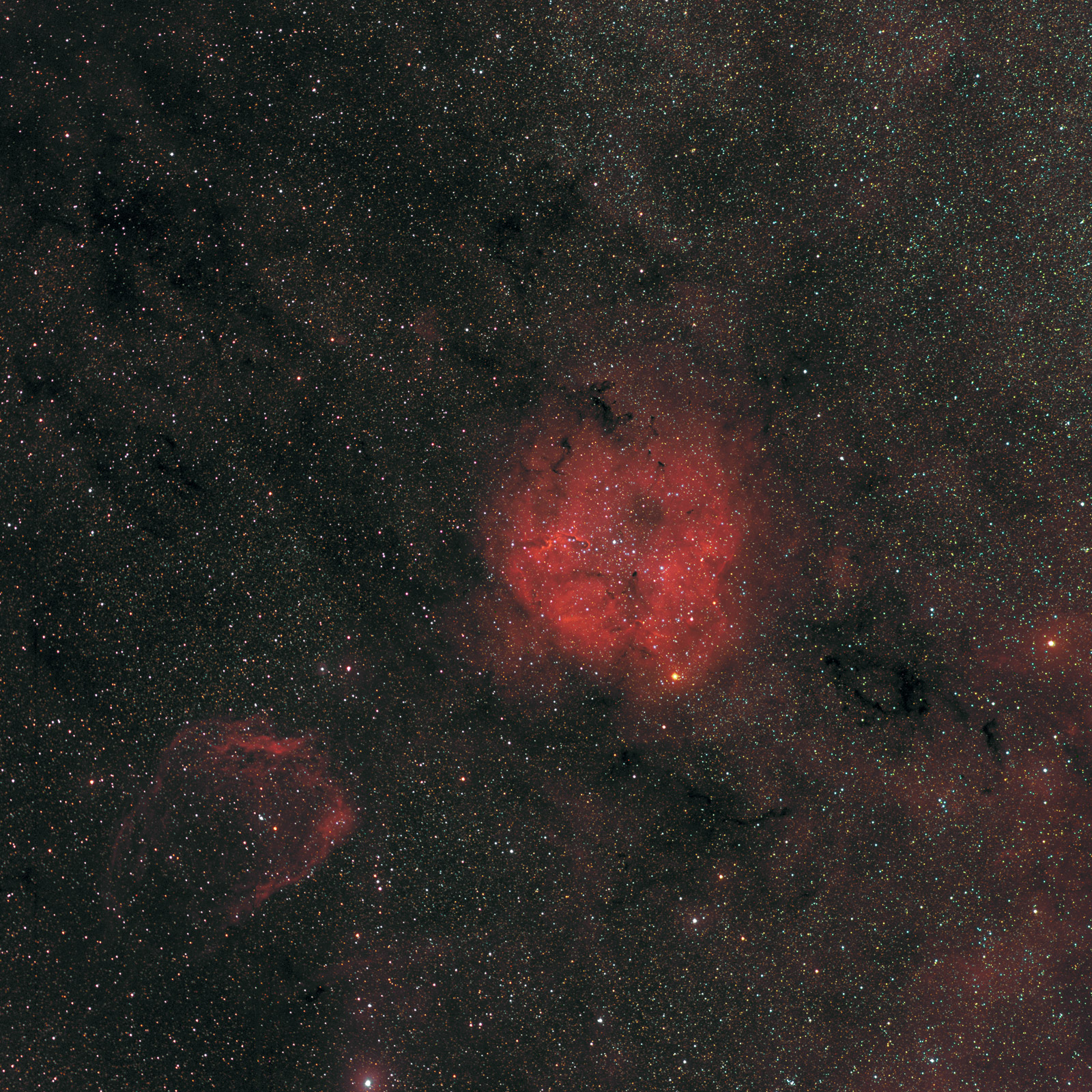 HalphaRGB-Aufnahme mit 10° Bildfeld zeigt die vielen interessanten H-alpha-Gebiete und Dunkelwolken in diesem Bereich.