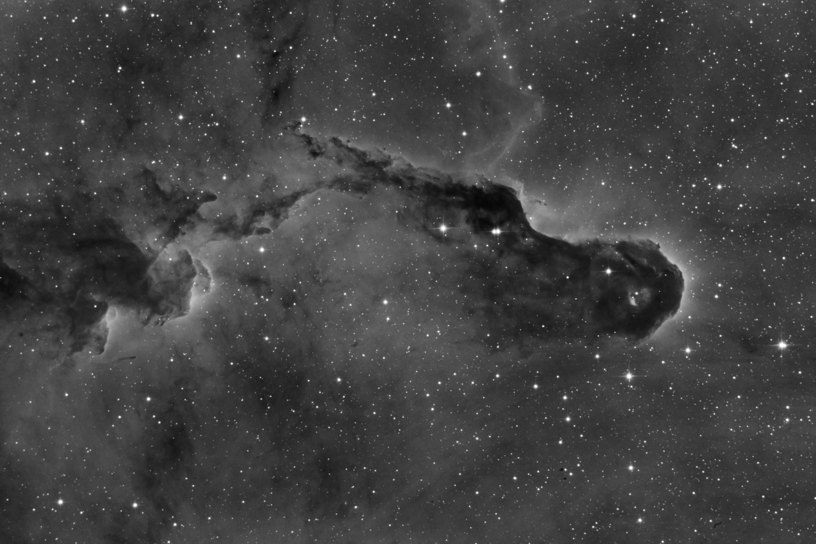 Ein immer wieder faszinierendes Objekt ist der Elefantenrüsselnebel mit einer Vielzahl an unterschiedlichen Strukturen, die sich im H-Alpha-Licht wunderbar zeigen.