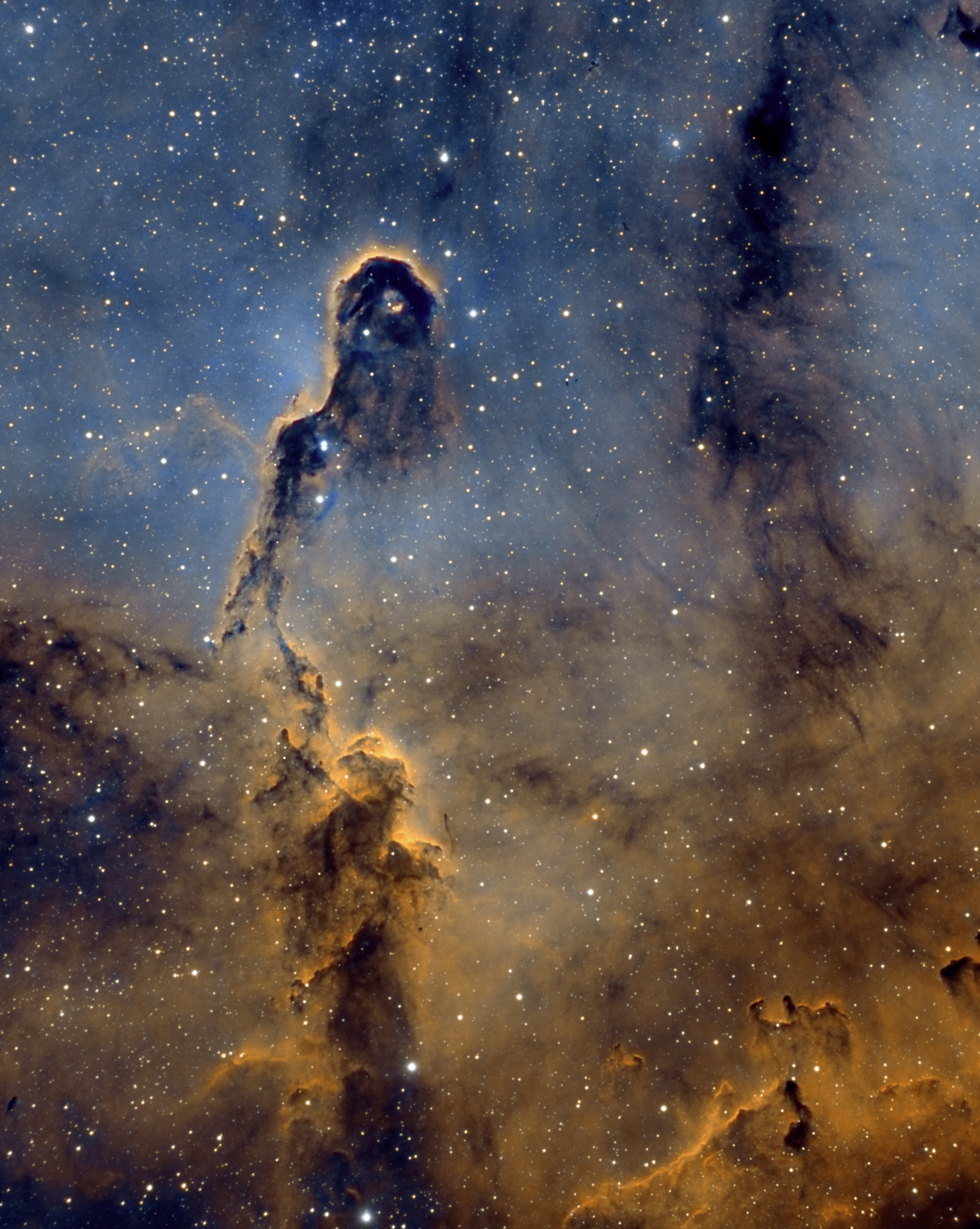 Teile der leuchtenden Gas- und Staubwolken dieser Sternbildungsregion, manchen als Elefantenrüssel bekannt, mögen unheimliche Formen haben, manche davon fast menschlich. Sogar der ganze Nebel sieht ein bisschen wie das Gesicht eines Monsters aus. Das einzige wahre Monster hier ist jedoch ein heller, junger Stern, der zu weit von der Erde entfernt ist, um gefährlich zu sein. Das energiereiche Licht dieses Sterns frisst den Staub der dunklen, kometenartige Globule. Strahlen und Winde aus Teilchen, welche dieser Stern abstrahlt, vertreiben ebenfalls Gas und Staub aus der Umgebung. Der IC 1396-Komplex, der fast 3000 Lichtjahre entfernt ist, ist relativ blass und bedeckt am Himmel eine Region mit einem Winkeldurchmesser von mehr als zehn Vollmonden. Kürzlich wurden mehr als 100 junge Sterne entdeckt, die sich im Nebel bilden. Dieses Bild zeigt die hellen zusammengefegten Grate, welche die Taschen aus interstellarem Staub und Gas umrahmen. Solche eingebetteten dunklen rankenförmigen Wolken enthalten das Rohmaterial für Sternbildung und verbergen Protosterne im undurchsichtigen kosmischen Staub.