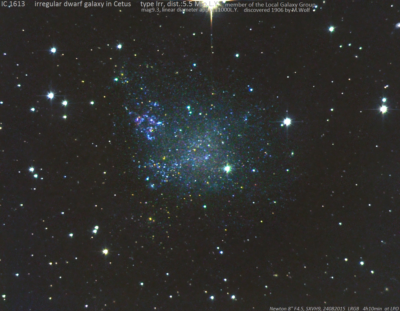 IC 1613 ist eine an Flächenhelligkeit schwache (9,3 mag) irreguläre Zwerggalaxie von Magellanic Cloud type (Irrmd). Sie weist viele junge blaue Sternassoziationen auf. Ihre Entfernung liegt bei fünf Millionen Lichtjahren. Entdeckt wurde sie 1906 von Max Wolf in Heidelberg.