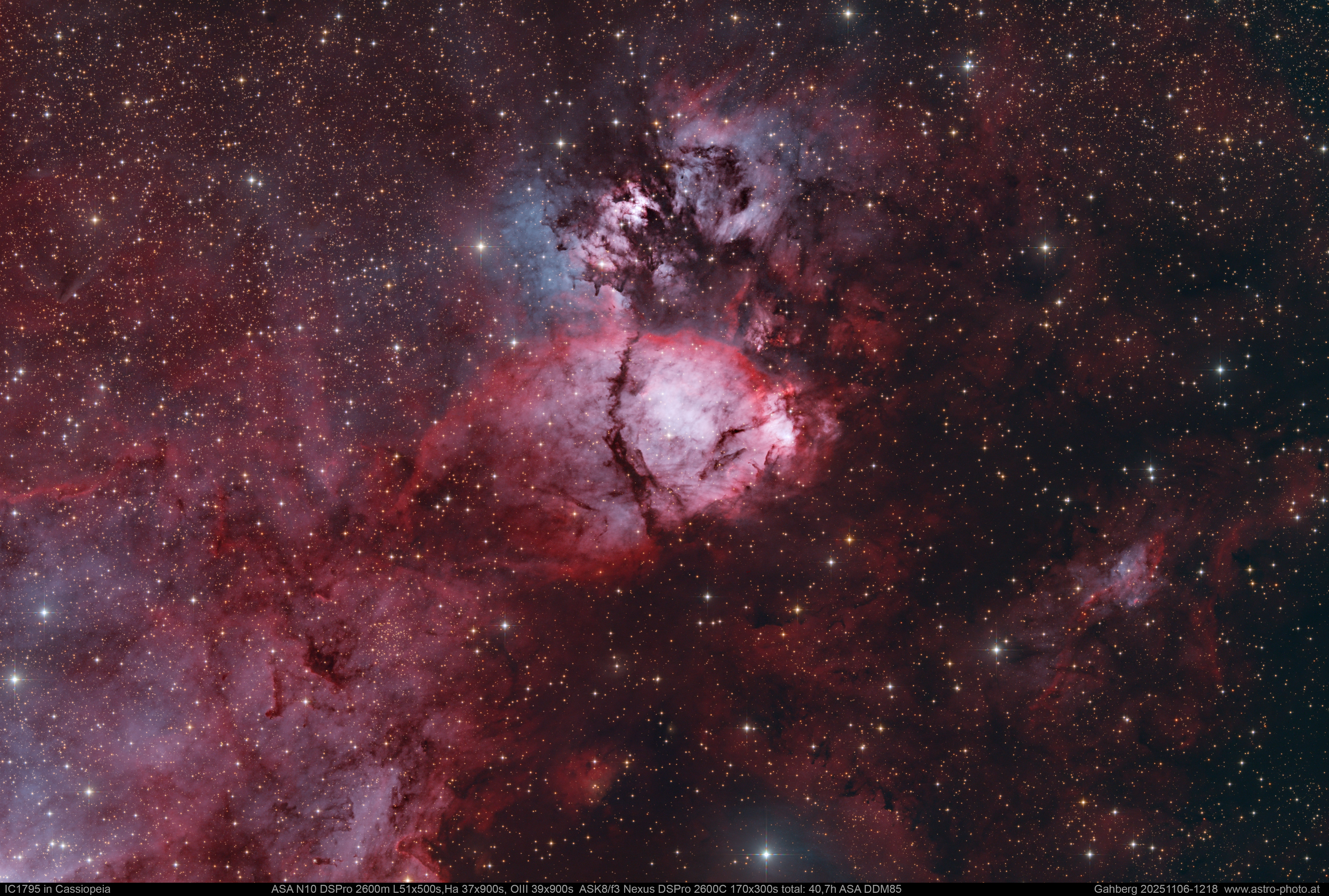 | Belichtungszeit | 40,7h gesamt. L 51 x 500s, C 170 x 300s, H-alpha 37 x 900s, OIII 39 x 900s |