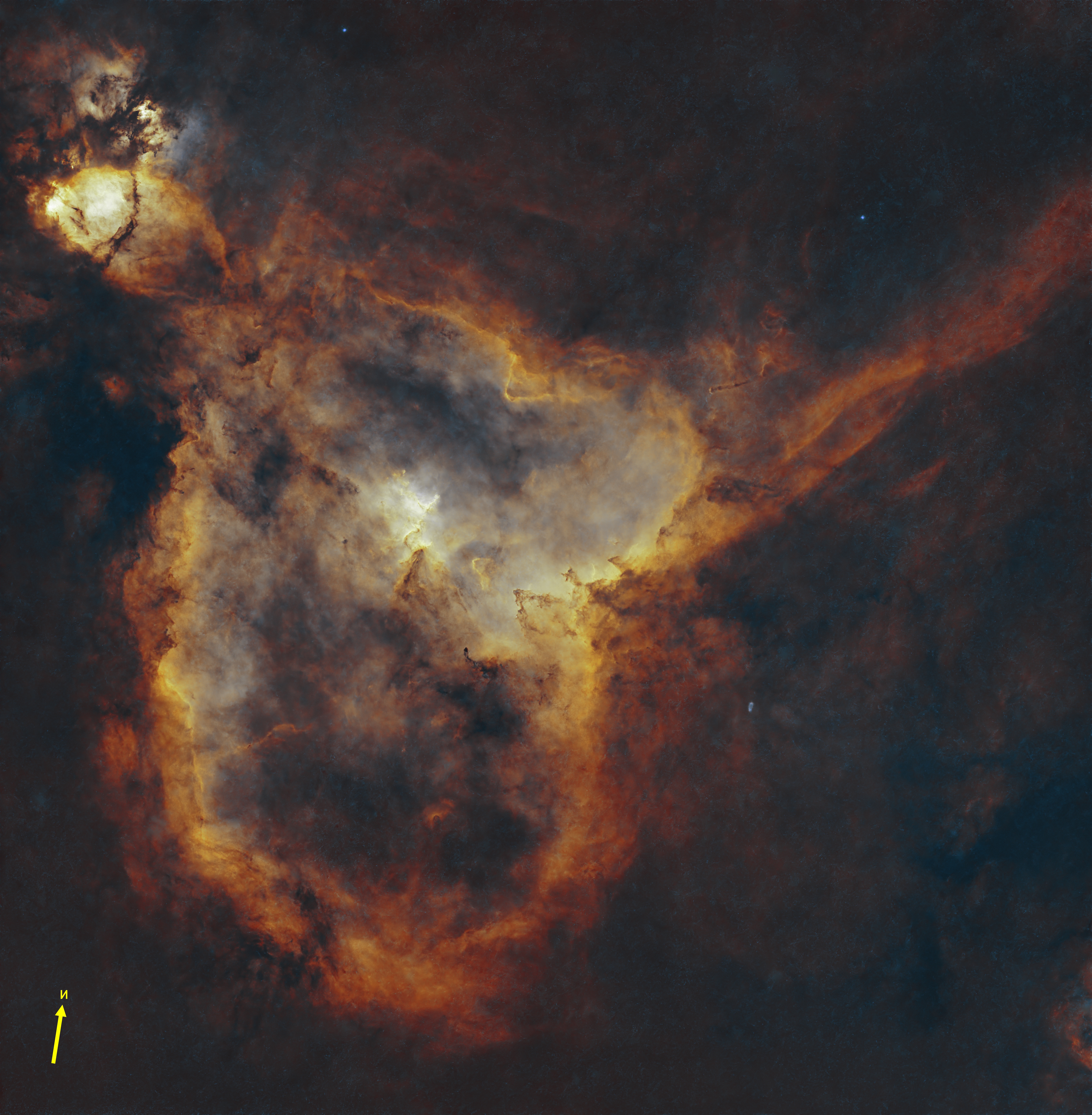 Im Perseus-Spiralarm unserer Milchstraße liegt der Herznebel in einer Entfernung von rund 6500 Lichtjahren. Ein Sternentstehungsgebiet mit zugehöriger HII-Region.